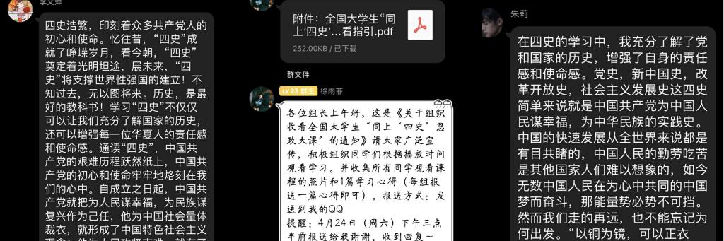 《四史思政大课》开课第一讲特别邀请北京师范大学赵朝峰教授、武汉大学卢勇教授和南京航空航天大学何畏教授,共同来感悟党领导人民进行艰苦卓绝的斗争历程,深入了解党的光荣传统、宝贵经验和伟大成就,从而传承红色基因,坚定理想信念。课后,同学们纷纷热议,在各自团小组中发表自己的心得。其中,朱莉同学说自己在四史的学习中,充分了解了党和国家的历史,增强了自身的责任感和使命感;李文萍同学说我们应该去承袭前辈留下的基业,牢记前辈一直遵守的初心,五千年文明的泱泱大国需要每一代人秉持着初心,牢记着使命去守护,发展,壮大。