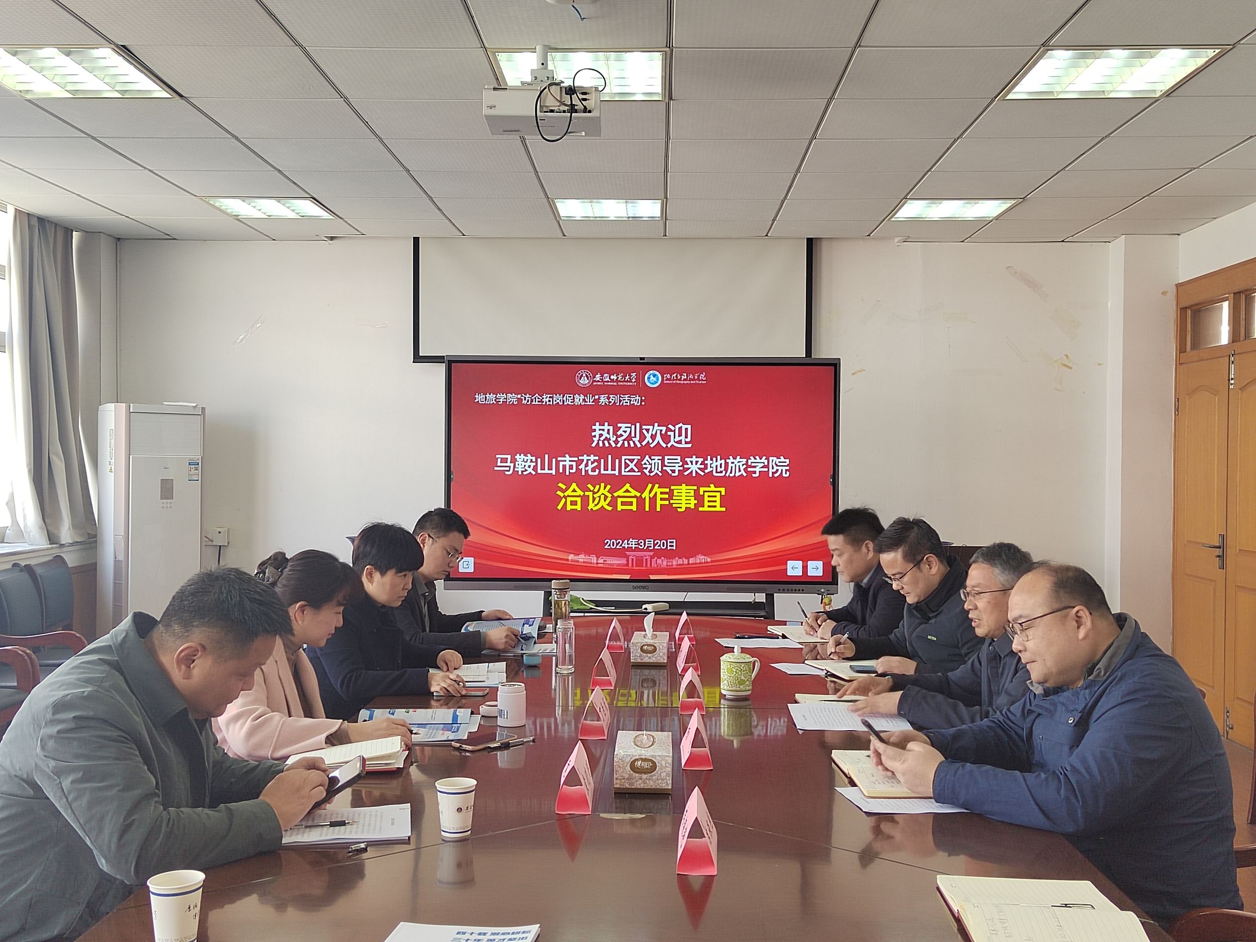 与马鞍山市花山区在学院四楼会议室举行政校合作交流会。马鞍山市花山区区委副书记、濮塘休闲度假区管委会党工委书记、主任丁巨凤,花山区人社局局长孙娟,花山区文旅体局局长袁晓明,花山区濮塘镇党委委员王秋翔,足探比分