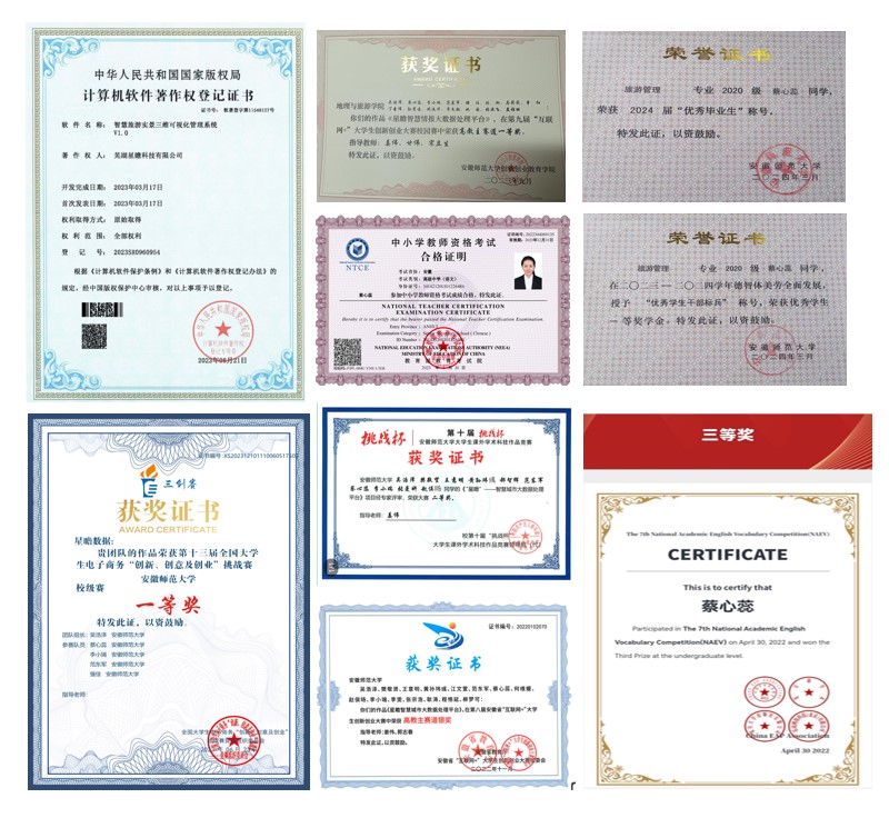 “立身以立学为先,立学以读书为本”。蔡心蕊专业课成绩良好,连续四年获校优秀奖学金,“优秀学生干部标兵”、“三好学生”等称号。现已推免至安徽师范大学,并考取高中语文教师资格证等多项证书。她依托良好的专业基础与学习能力,积极参与创新学习竞赛活动。她参与大学生创新创业训练计划获国家级立项,第七届全国大学生学术英语词汇竞赛获国家级三等奖,第八届“互联网+”大学生创新创业大赛获省级银奖,第九届“互联网+”大学生创新创业竞赛获省级铜奖以及其他校级以上奖项十余项,并拥有计算机软著一项。坚定大学生以学习为先的原则,助推个人发展,让创新之花盛开在多彩青春。