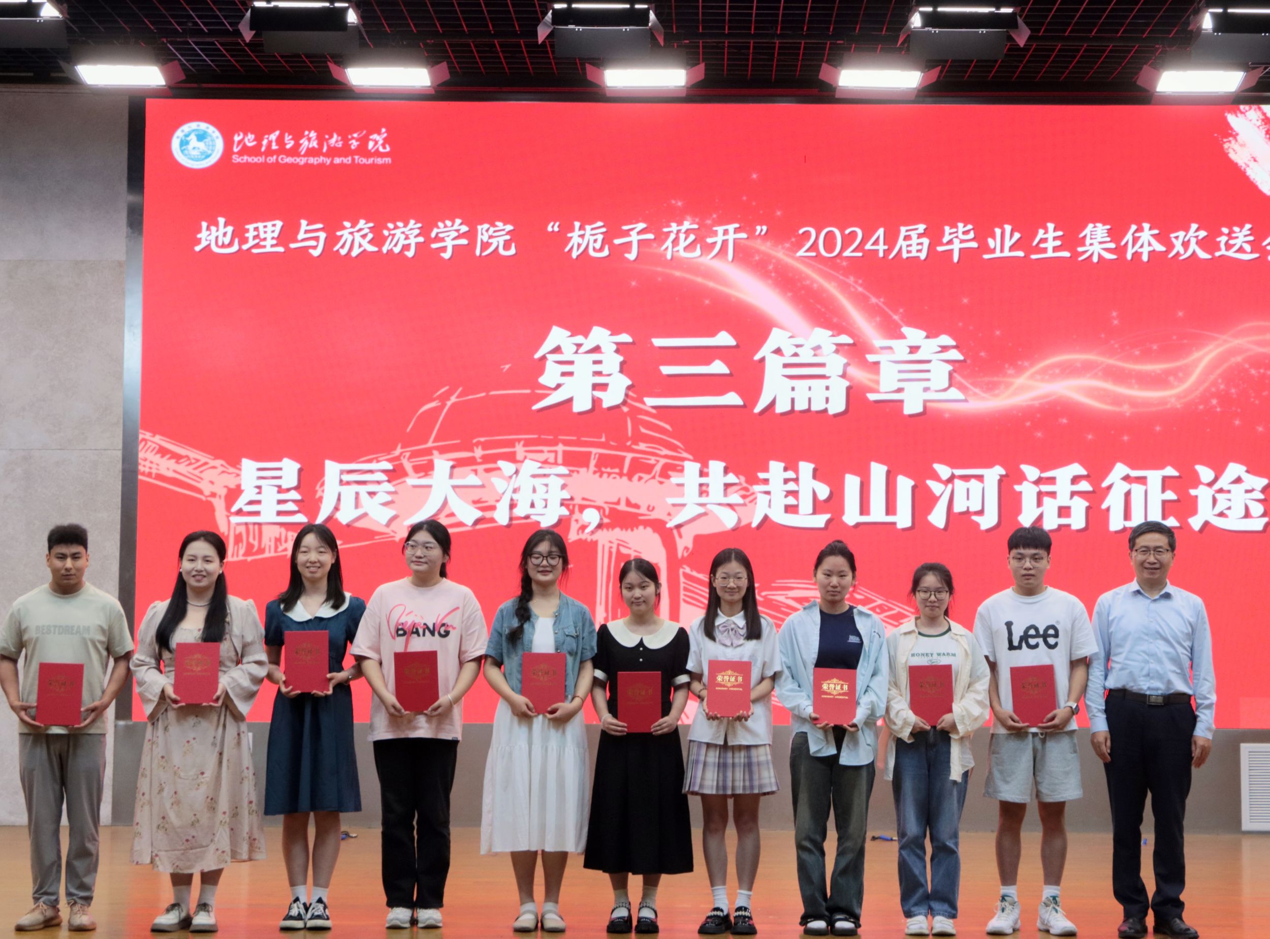 毕业研究生代表、2021级人文地理学专业朱可馨、本科生代表、2020级旅游管理专业舒玉茹在不舍中回望校园,感恩母院,信心满满地展望前程。毕业班辅导员代表彭媛媛与旅游管理专业教授杨钊,分别上台为毕业生寄语,老师们的殷殷嘱托与深情期望为毕业生奔赴远方再次指明方向。方凤满在致辞中希望毕业生们能够在未来的道路上以进取与担当、自适与真诚、自爱与感恩的青年形象书写生命的精彩。
