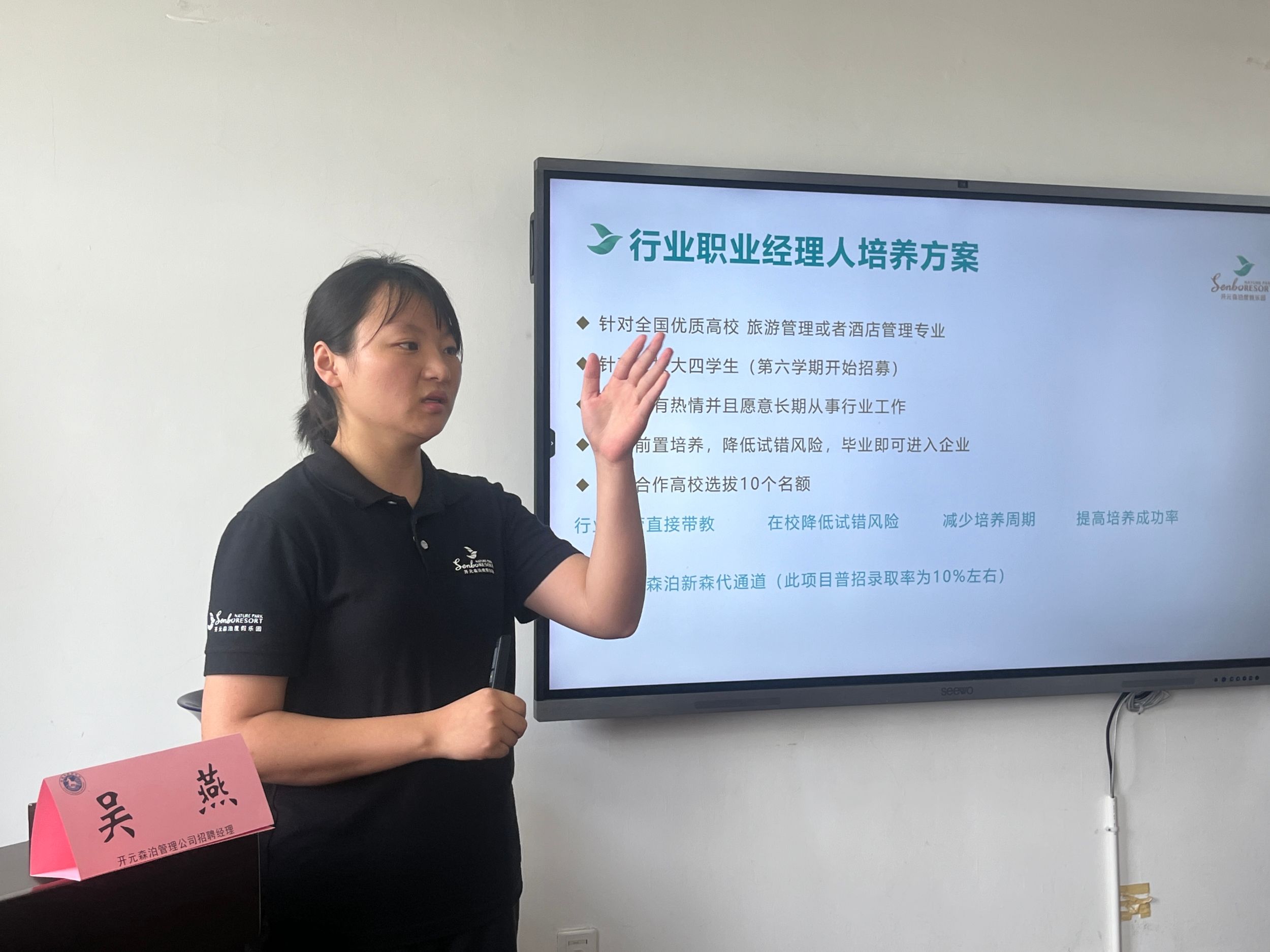 吴燕经理围绕开元旅业集团、森泊度假乐园和“旅游职业经理人培育计划”人才培养方案展开介绍。开元旅业集团以酒店为主导产业,同时拥有房产、乐园、商业、工业、文旅等产业,开元森泊度假乐园是开元旗下的大型旅游度假综合体品牌。入选“旅游职业经理人培育计划”的学生将优先进入森泊新森代通道。介绍后,同学们热情高涨,与陈静总监等企业高管交流互动。陈静总监对足探比分