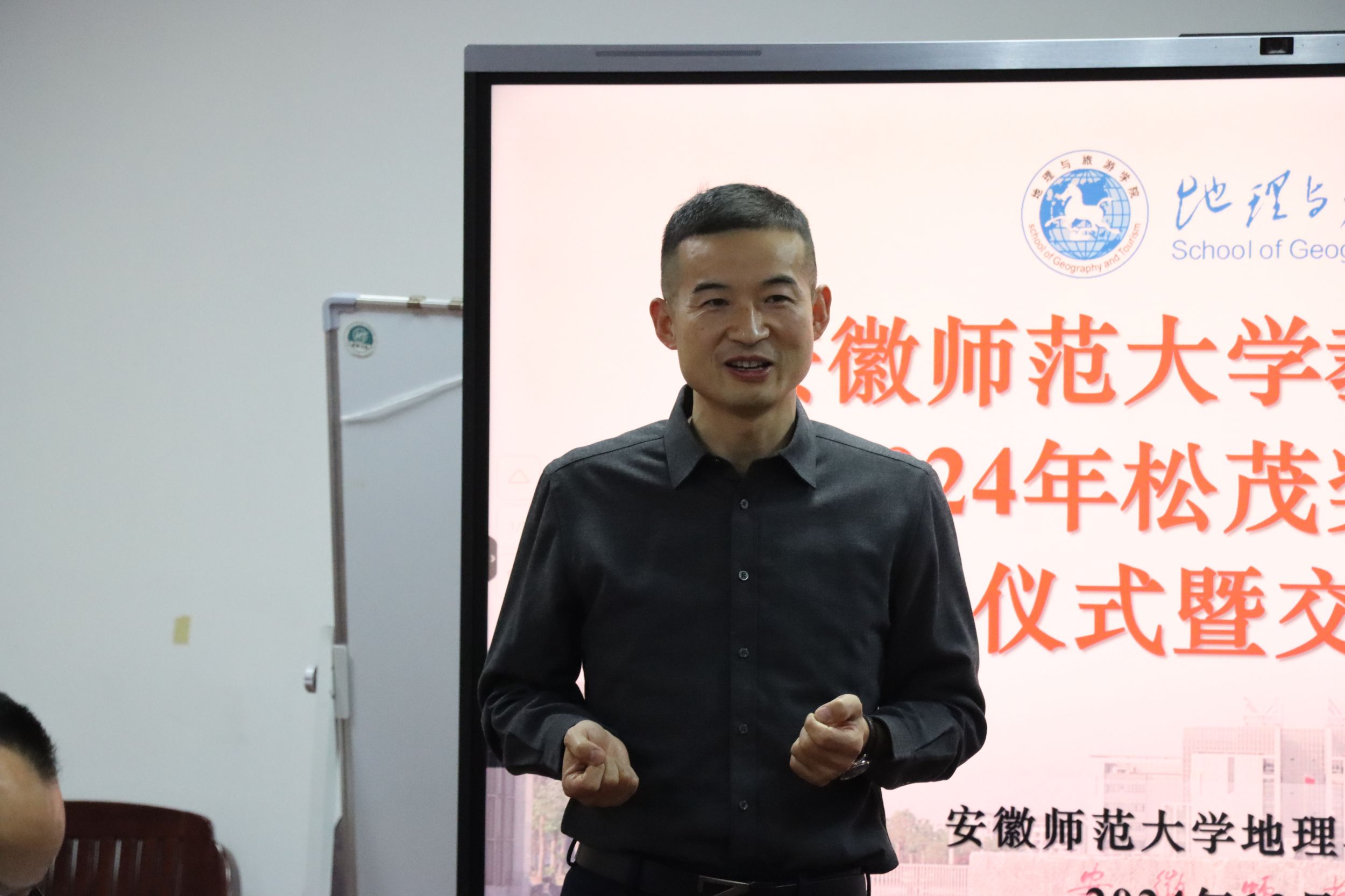 王如意向朱立松校友颁发捐赠证书。朱立松表达了自己对师大栽培的感恩之情,在分享自己创业经历时提到自己也曾有过迷茫,但最终凭借着坚定的信念坚持到最后。他鼓励学生在大学期间应当珍惜时间、把握当下,勉励学生多探索、多尝试,不断奋斗,展示地旅学子风采,诠释师大精神。周乐为对受助学生表达了认可和祝贺,他提到自己通过努力获得了从0到1 的突破,他表示帮助别人也是对自己的正向反馈。贾冠忠在讲话中表示,学院近年来取得的成绩离不与校友们的支持和关心,接下来,学院将牢牢把握立德树人的根本任务,以大学生护航行动计划为支撑,深度发掘资助工作的育人价值。