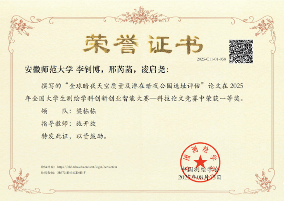 其中,2022级地信专业本科生李钊博、刑芮菡、2024级地信本科生凌启尧获得科技论文竞赛一等奖,指导老师为施开放;2023级地信专业本科生王海贝获得无人机航测仿真比赛一等奖,指导老师为季青;2023级地信专业本科生唐丹丹获得无人机航测仿真比赛二等奖,指导老师为梁栋栋。