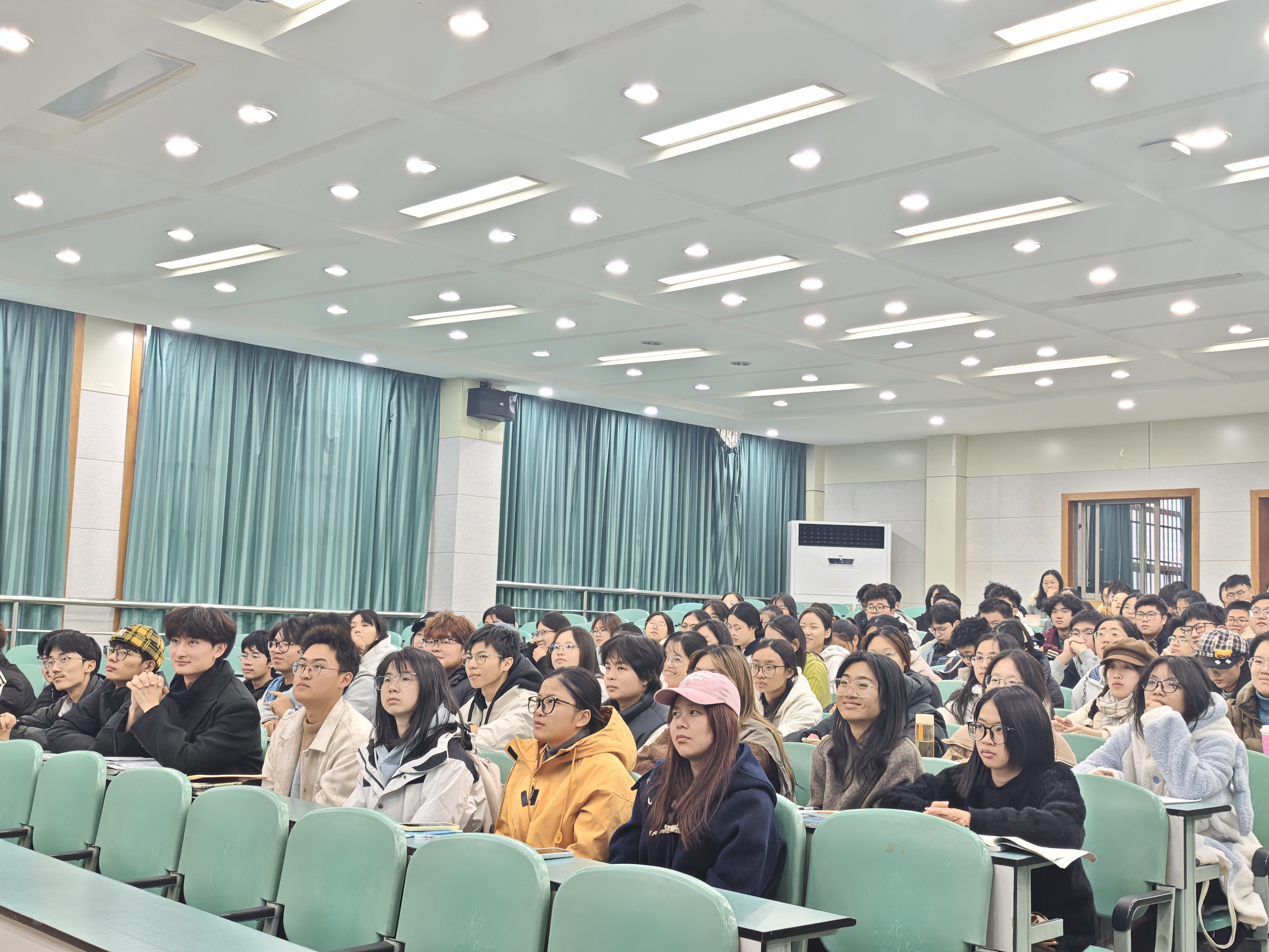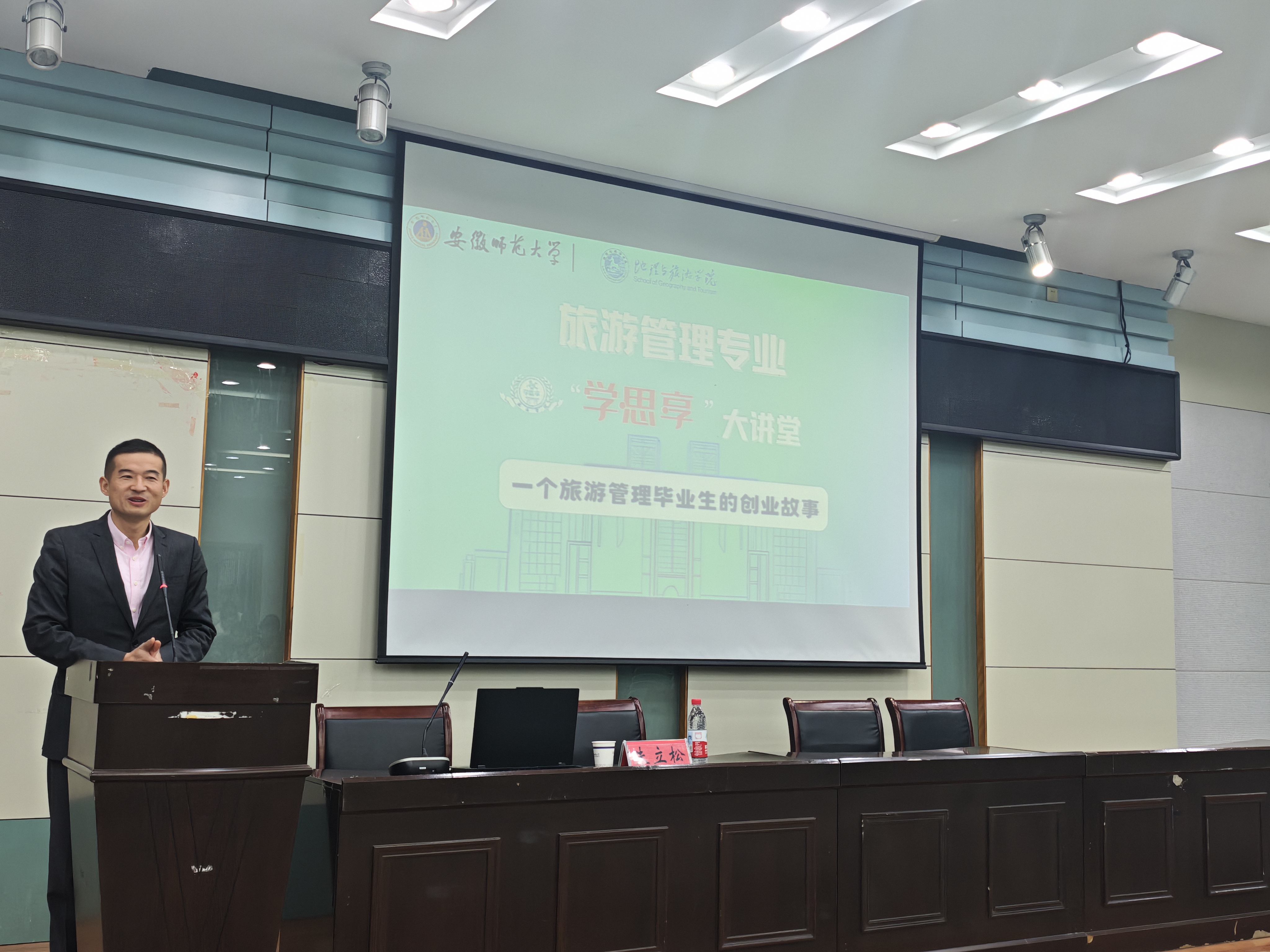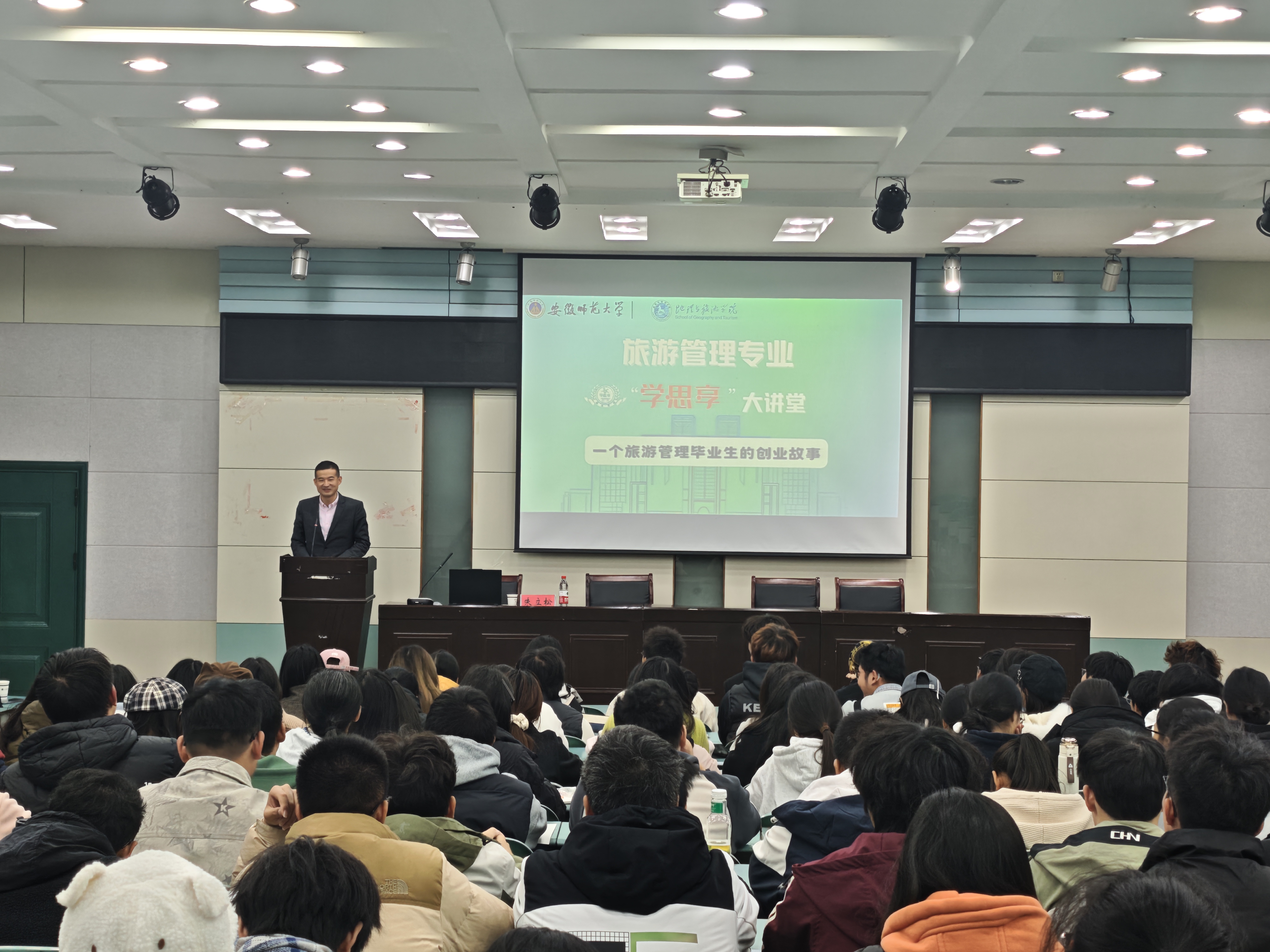 “学·思·享”大讲堂在实验楼101报告厅举行。本次活动特邀2005届旅游管理专业优秀校友、宁波松茂包装有限公司董事长朱立松担任主讲,旅游管理专业负责人尹寿兵、辅导员吴文涵老师及旅游管理专业全体新生参与活动。