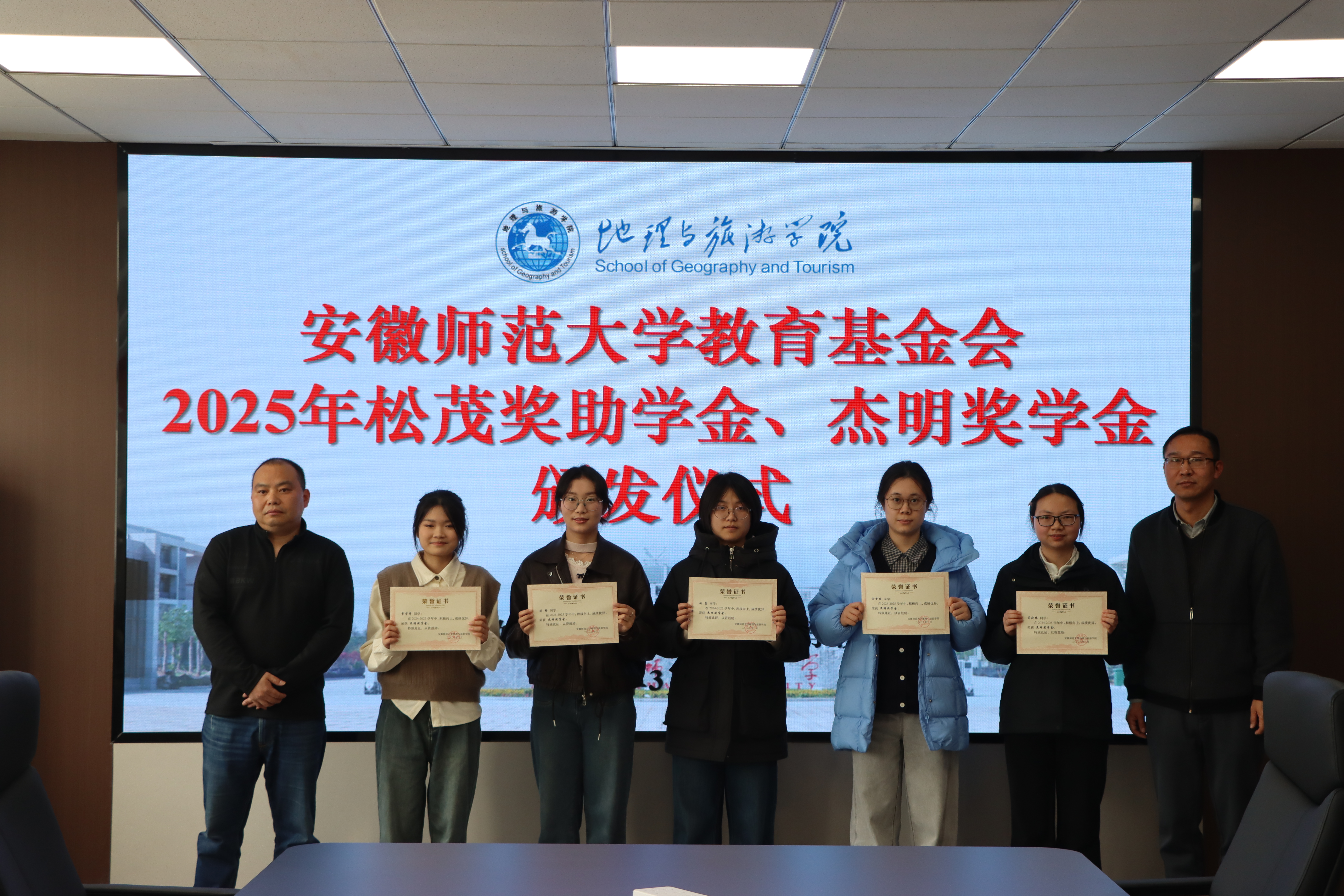 在学院行政楼三楼会议室举行2025年松茂奖助学金、杰明奖学金颁发仪式。宁波松茂包装有限公司总经理朱立松、余姚市杰明喷雾器有限公司总经理王结明,校教育基金会副理事长兼秘书长王如意、学生处副处长项家春、学院党委书记张顺、旅游管理专业副主任张伟,学院专兼职辅导员、获奖受助学生代表参加颁发仪式。仪式由学院党委副书记钱程主持。