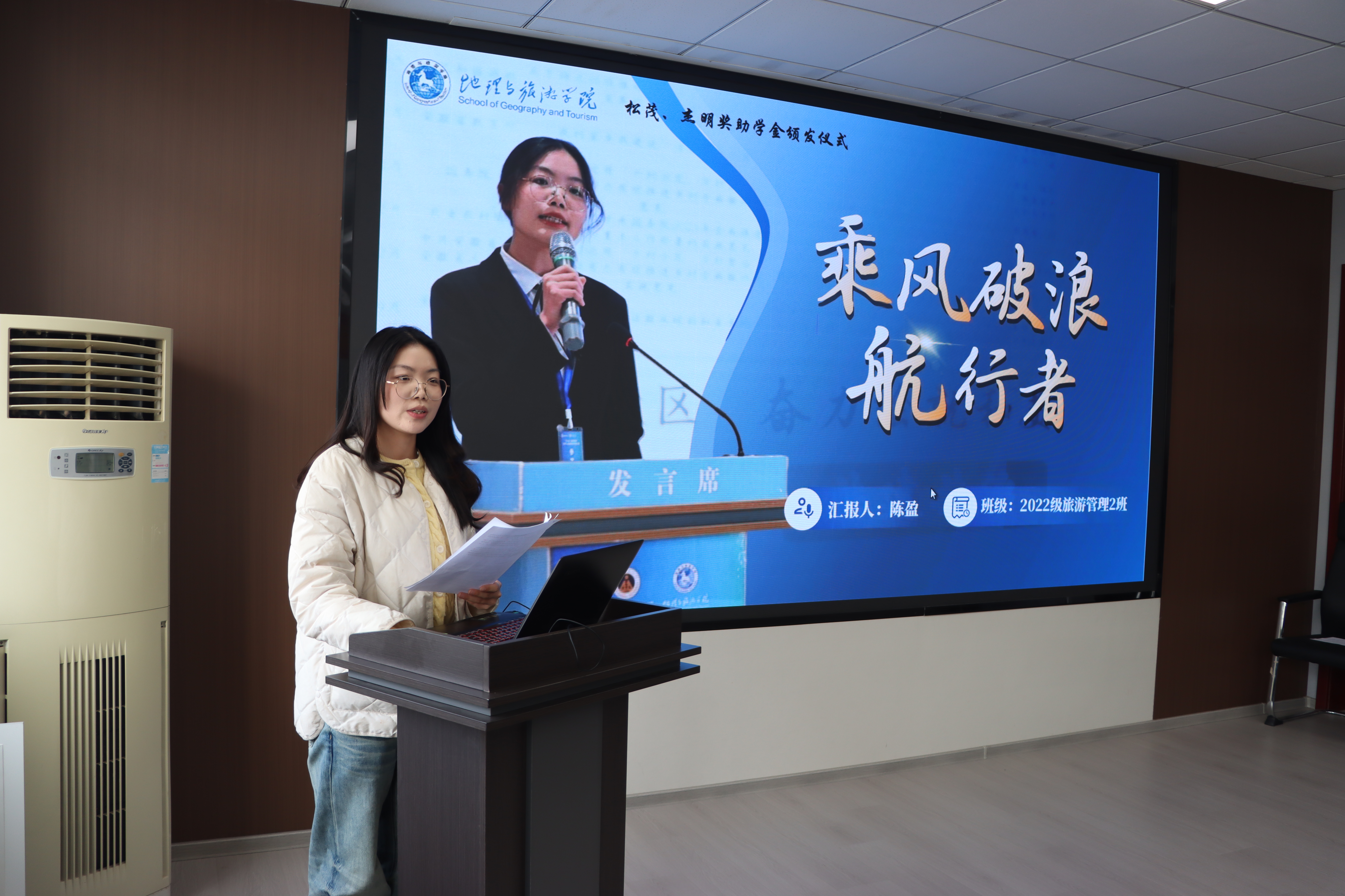 在交流阶段,2022级旅游管理专业陈盈从理想信念、专业学习、学生工作及社会实践等角度回顾大学阶段成长历程,坚定信念、红心向党,热心服务、担当领航,学以致用、拓展视野,她将自己形容为乘风破浪的航行者,向宁波松茂包装有限公司的慷慨资助、学院的栽培及师长同窗的指导和帮助表示由衷的感谢;2024级地理科学(师范)专业章背背以院训“经天纬地,弘道明理”为指引,她将自己形容为扎根生长的地理人,向王结明先生的慷慨资助及母校、师长的悉心培育表示由衷感谢;2024级土地资源管理专业孙睿颖从勤学笃行、自立自强、传递温暖、勇担责任等角度回顾成长历程,向资助方及母校、老师的悉心培养表示由衷感谢。