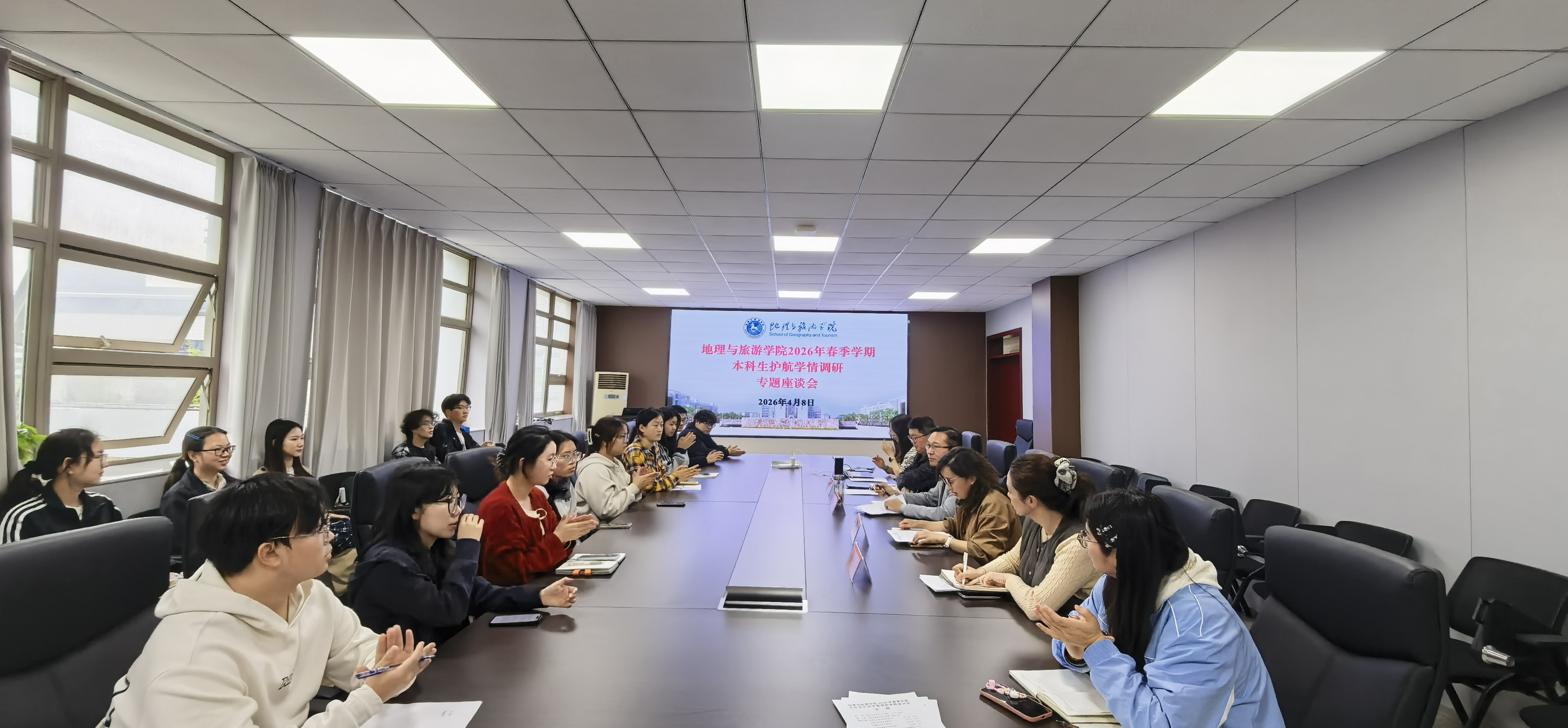 组织召开2026年春季学期本科生、研究生护航学情调研专题座谈会。会议结合专业特点,分设本科地理地拔地信、旅游土地城规和研究生三个分会场同步进行。学院领导班子成员、各专业负责人、点长代表、全体辅导员及各班级学生代表共同参会。