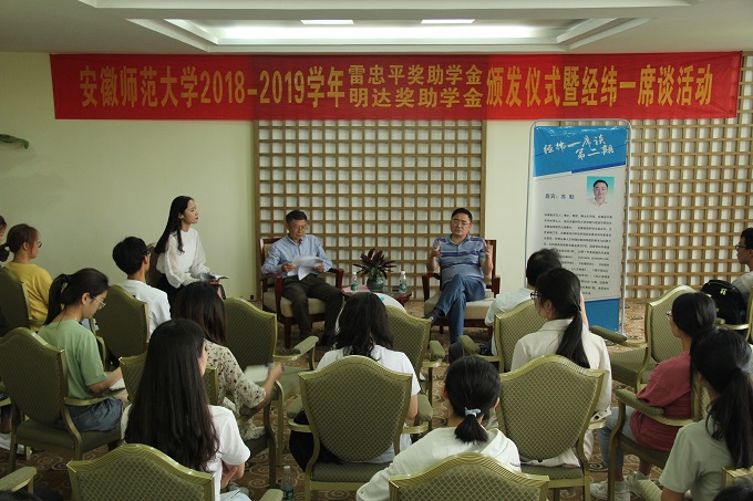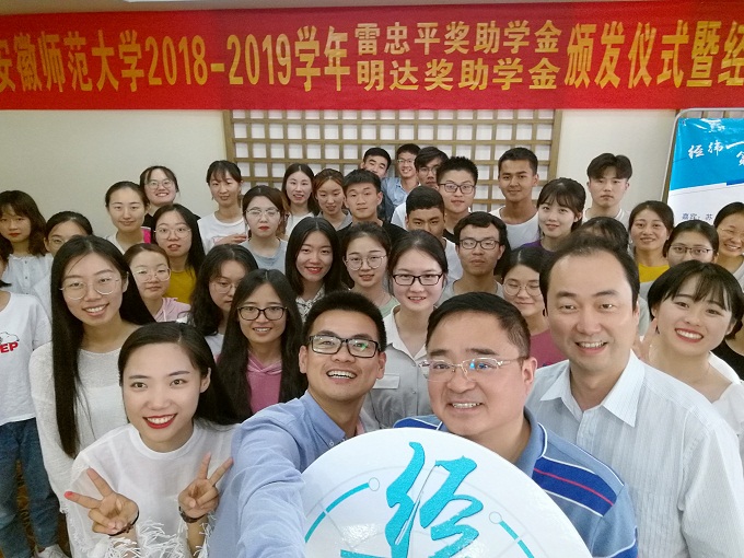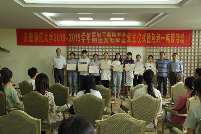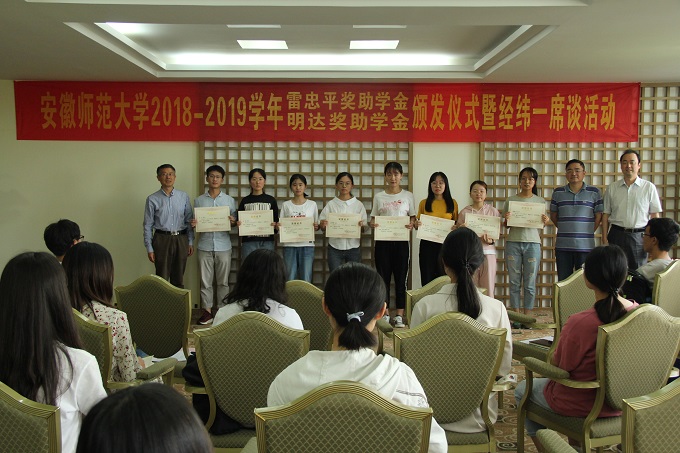 本次活动分为两项议程,首先举行安徽师范大学2018-2019学年雷忠平奖助学金、明达奖助学金颁发仪式。仪式上,主持人介绍了两项奖助学金的基本概况,雷忠平奖助学金和明达奖助学金分别于2012年和2016年在球探足球比分app