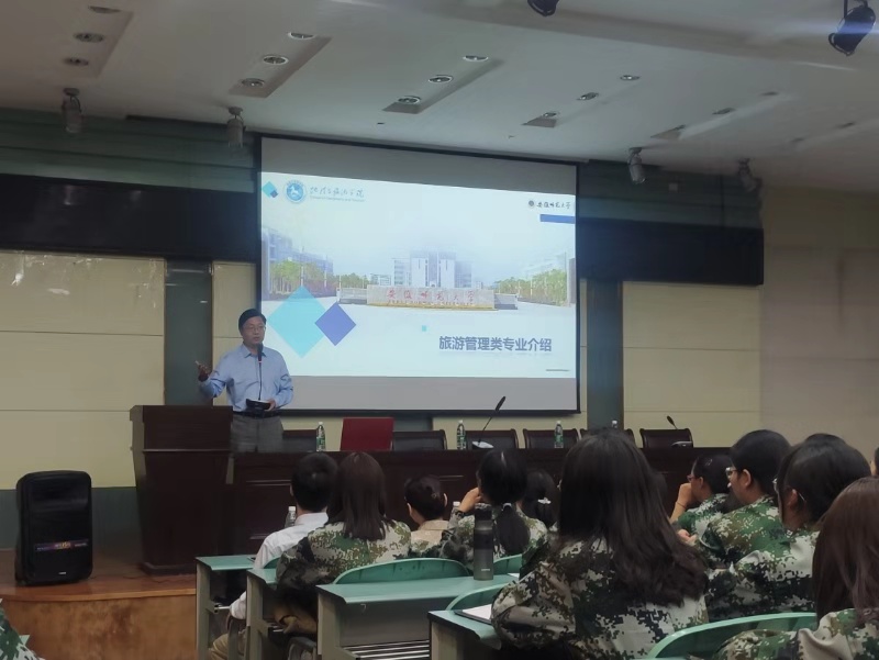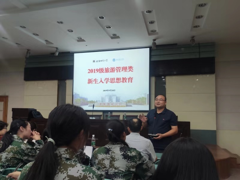 旅游管理专业负责人、博士生导师杨效忠教授主讲。杨效忠向同学们全方位介绍了学院简史、人才培养方案、专业人才毕业发展方向、专业实践与科研平台,重点强调了外语应用能力、创意策划与学术研究等能力的培养,及批判性思维、价值判断思维的培育要求。