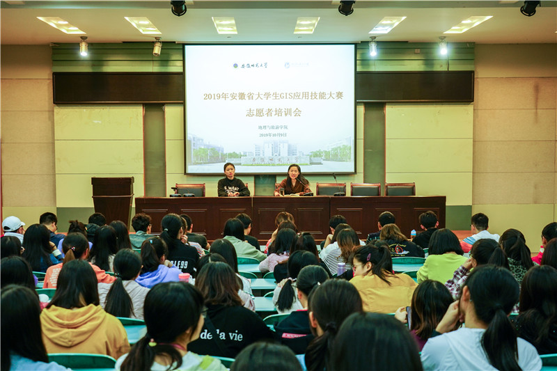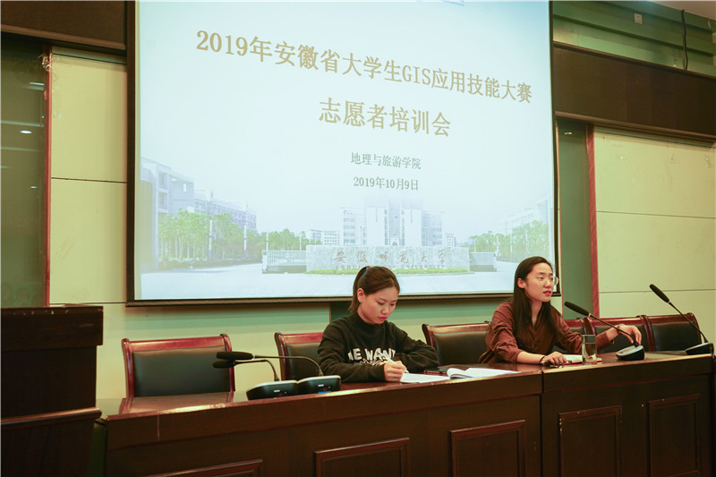 于学院实验楼101报告厅开展2019年安徽省大学生GIS应用技能大赛志愿者培训会。院团委副书记陈祥云,2018级学生辅导员吴文涵,GIS应用技能大赛全体志愿者参加此次会议。