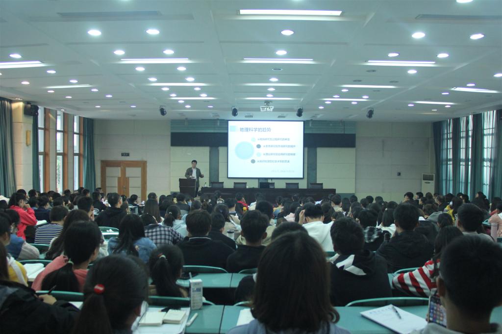 党委书记贾冠忠,相关专业教师,部分专业研究生和2019级地理科学大类全体新生聆听了报告。报告由足探比分