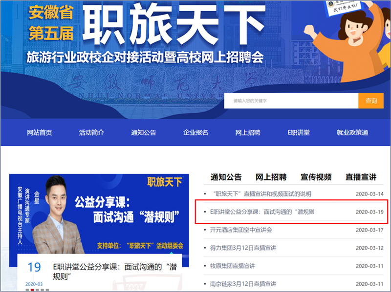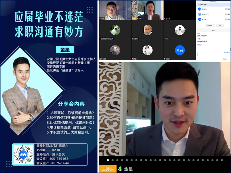 据悉, E职讲堂是我校主办的安徽省第五届“职旅天下”旅游行业政校企对接活动暨高校公益网上招聘会的特色活动之一,活动主办方为主动应对新冠疫情,在往年“职旅天下”政校企系列活动线下论坛的基础上,今年首次在线上搭建了空中在线讲堂,该讲堂通过“职旅天下”活动线上平台,整合各类直播平台、网络视频会议室、数字公开课等线上资源和政府、高校、企业等线下资源,集线上专业思想教育、行业认知教育、就业创业指导、职业规划发展、政校企高峰论坛等功能于一体。活动第一期邀请到的主讲嘉宾金星,系我校2003级政教系校友,现为安徽卫视《男生女生向前冲》主持人、安徽经视《第一时间》新闻主播、当众讲话“金星说”创始人。活动近期还将邀请学界专家、业界精英、知名校友等为广大学子在线直播授课,提供切实有效的指导服务,促进广大毕业生顺利就业。