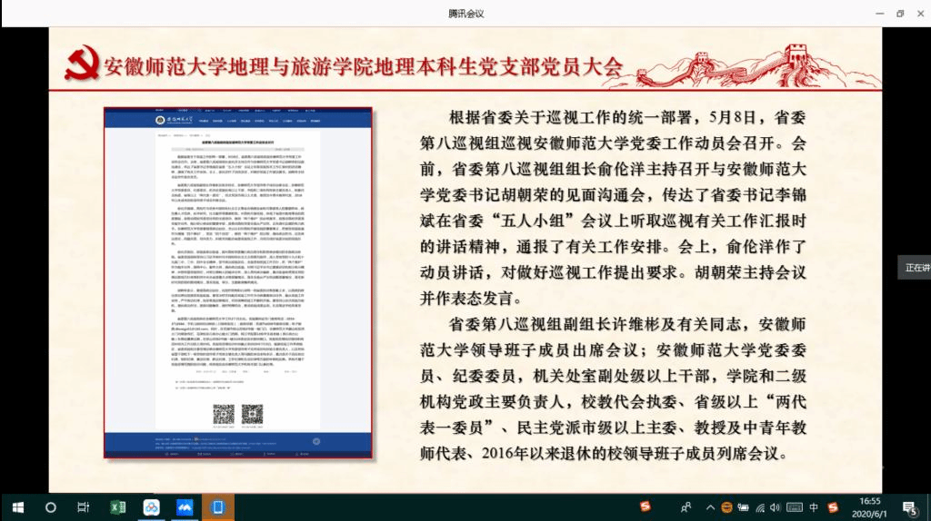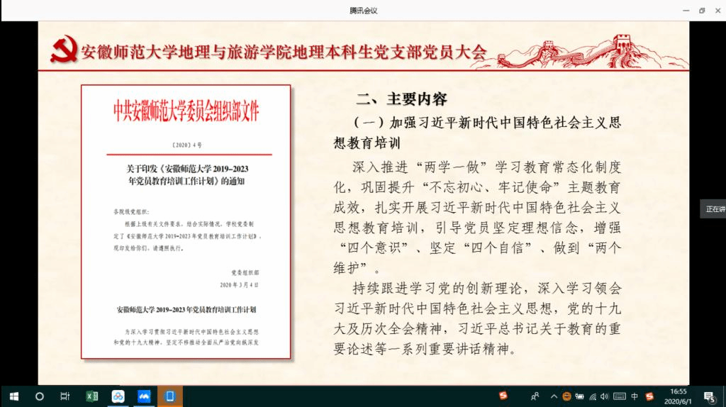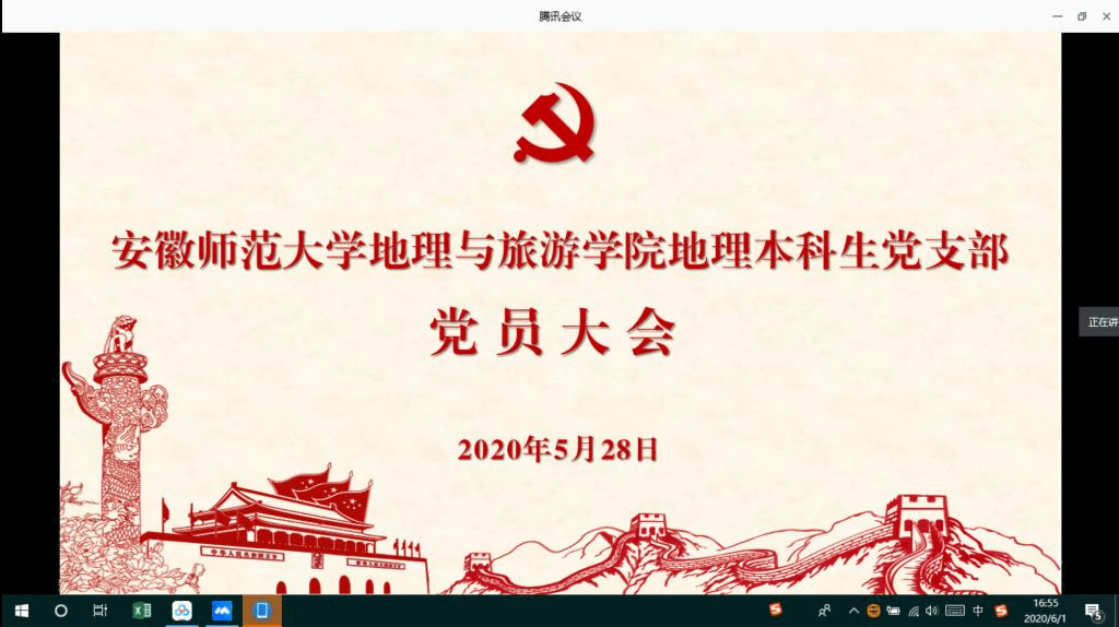齐小学)5月28日晚,地理本科生党支部利用腾讯会议网络平台召开党员大会,传达学校重要文件精神,贯彻落实学校党建工作重要要求,扎实推进标准化规范化建设。党支部全体成员参加会议。会议由党支部书记齐小学主持。