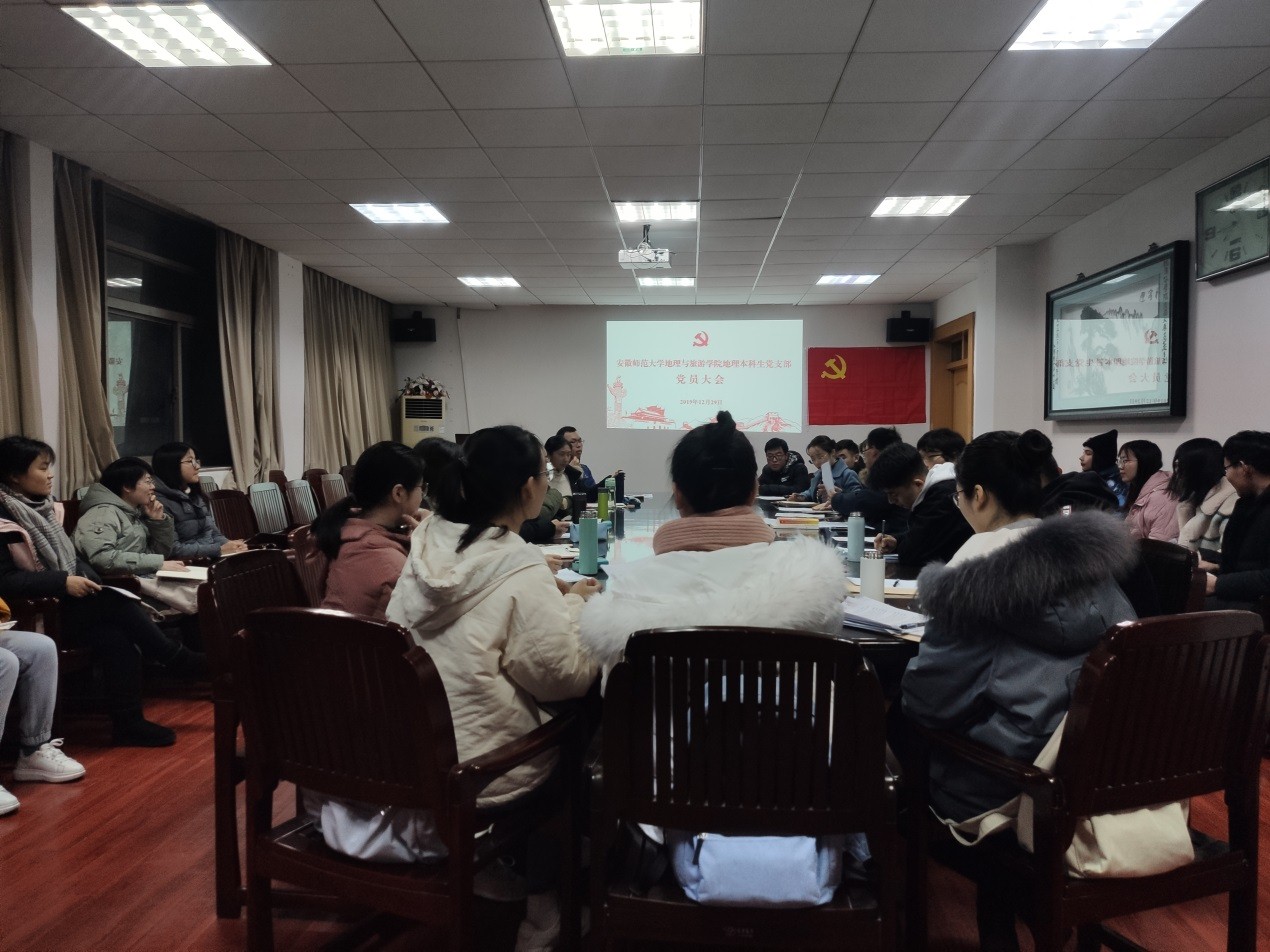 罗勇 齐小学)12月29日晚,地理本科生党支部在学院行政楼三楼会议室召开党员大会,讨论决表决王琨、余何愚、尚娜娜、沙雪琴、丁茹栩等5名预备党员转正事宜,党支部在校正式党员、预备党员参加会议,到会有表决权的正式党员人数符合法定要求。会议由党支部书记齐小学主持。