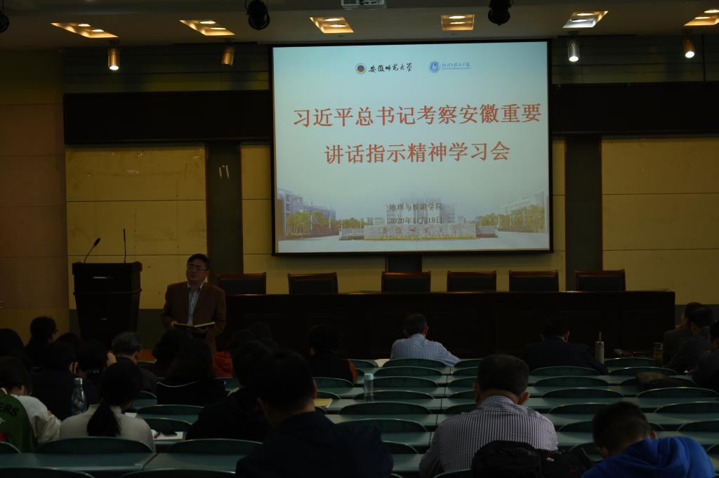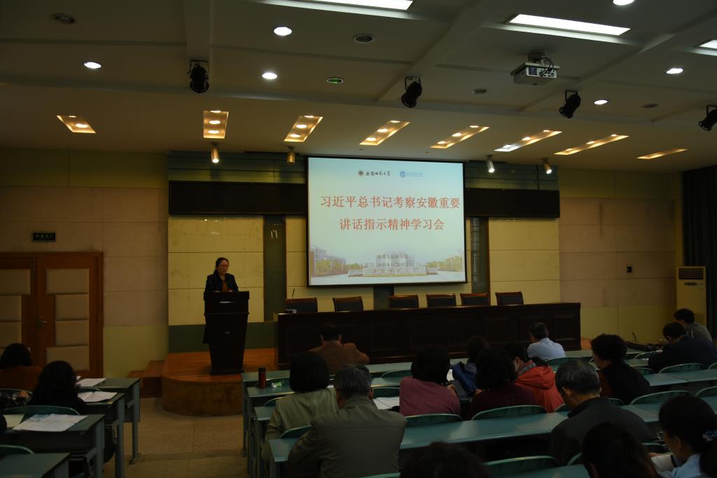 于实验楼101报告厅组织开展学习习近平总书记视察安徽重要讲话精神学习会,由院长苏勤领学,副院长方凤满做专题发言,学院全体教职工参与本次学习。
