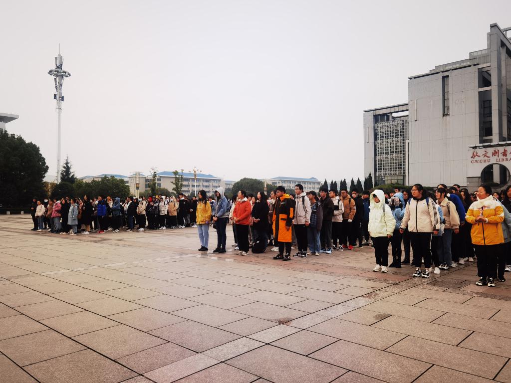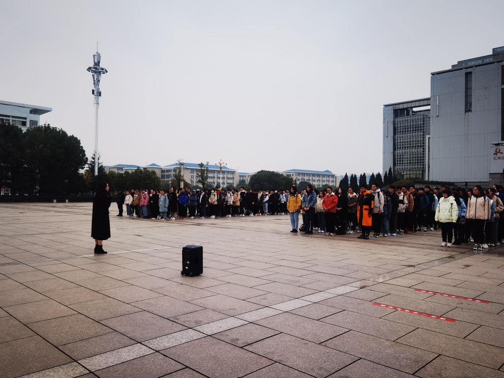 于花津校区敬文图书馆东侧广场举行校园升国旗活动。国旗护卫队升旗,2020级新生辅导员及全体新生参加活动,活动由赵佳慧主持。
