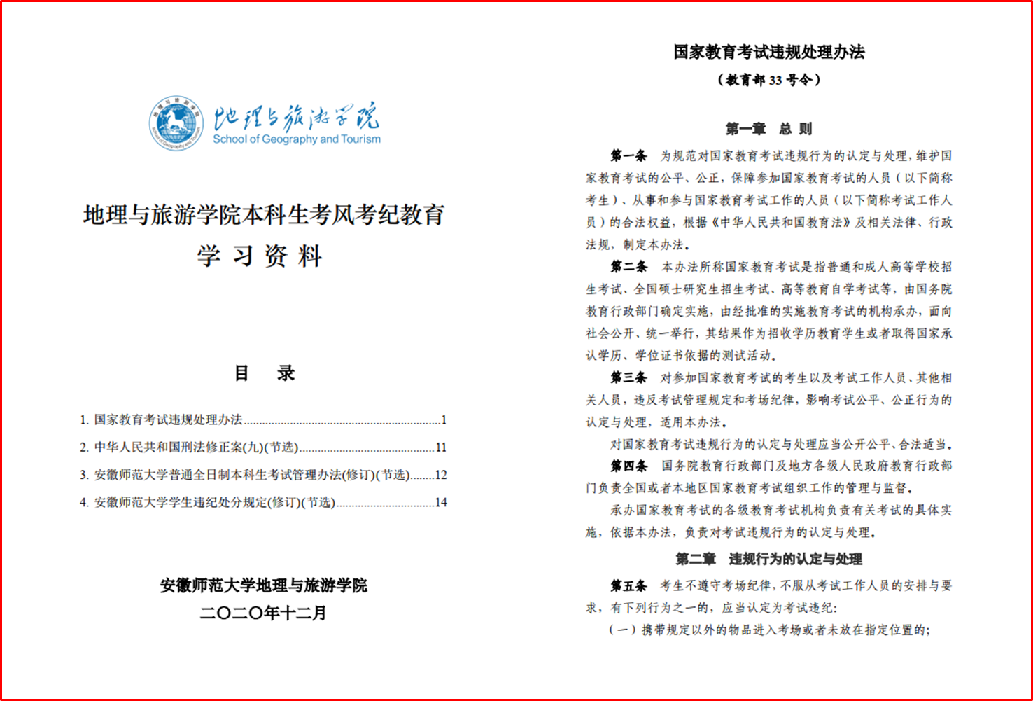 编订学习资料,宣传法律规定。为进一步提高学生对考风考纪相关法律法规的认识和了解,学院安排专人整理国家教育考试违规处理办法、安徽师范大学学生违纪处分规定(修订)等法律规定,编订了考风考纪教育学习资料,组织学生认真学习,提高思想认识。