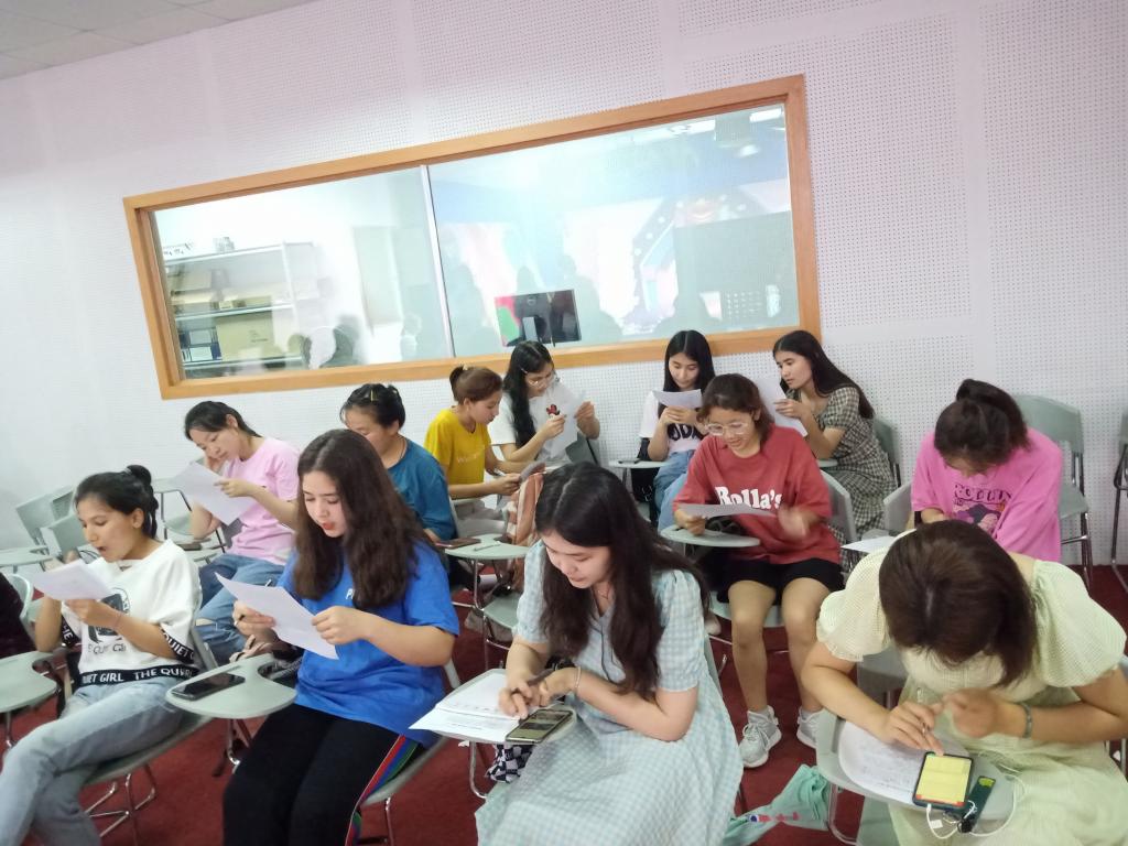 接着两次的普通话实践教学课由章海钰、普通话协会会长李璇以及2018级播音主持与艺术专业班长张尊贤一起负责。首先,他们向同学们分发了相关的学习资料,供同学们学习练习。随后,他们让大家先自己练,再一个一个找老师读。每位同学都以十分认真的态度对待此次热身练习,在手机上先查好正确的读法,再和自己附近的伙伴一起相互练习,相互指正,练习完毕后陆续找老师读,再根据老师指出的问题进行针对性的练习。第二次课后,章海钰给同学们布置了第一次的课后作业,要求同学们利用空闲时间看一则短新闻,跟着主持人的发音一起练习,这样将更有利于大家练习和纠正声调和声高不准的问题。课上,李璇带着大家练习了平舌翘舌,前鼻音后鼻音,并一一指出了大家发音时存在的问题,重点强调要进行针对性的、对症下药的练习。