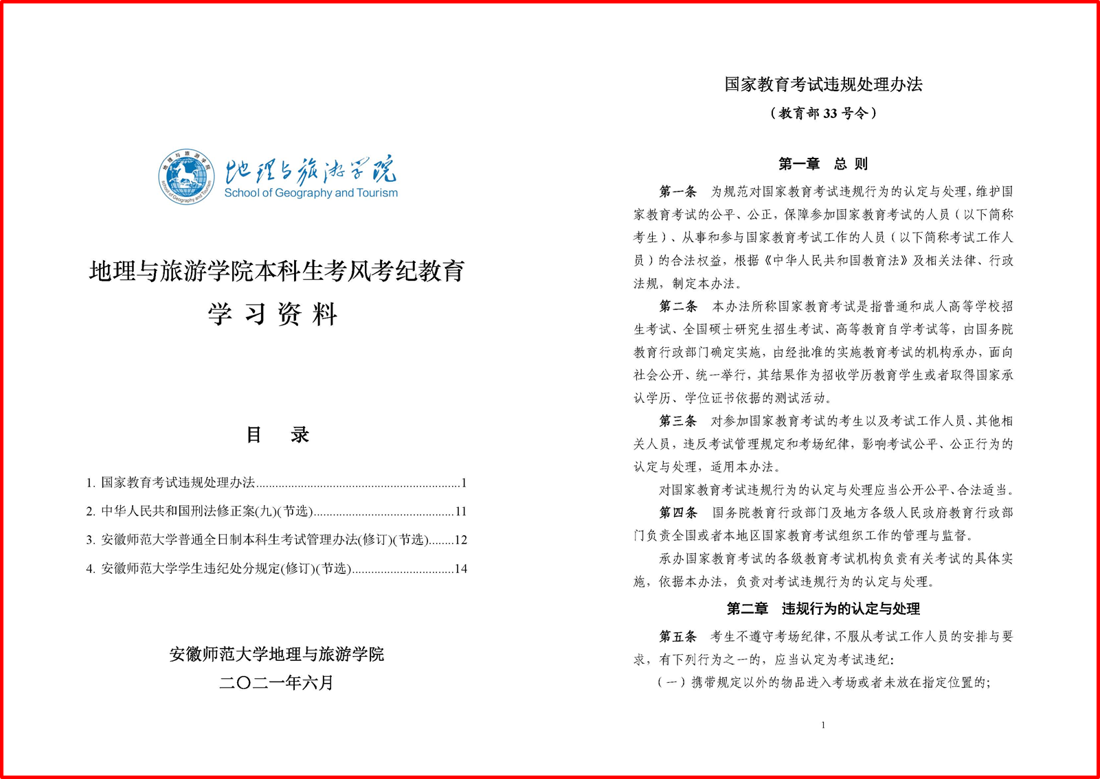 编订学习资料,宣传法律规定。为进一步提高学生对考风考纪相关法律法规的认识和了解,学院编辑整理国家教育考试违规处理办法、安徽师范大学学生违纪处分规定(修订)等法律规定,编订了考风考纪教育学习资料,组织学生认真学习,提高思想认识。