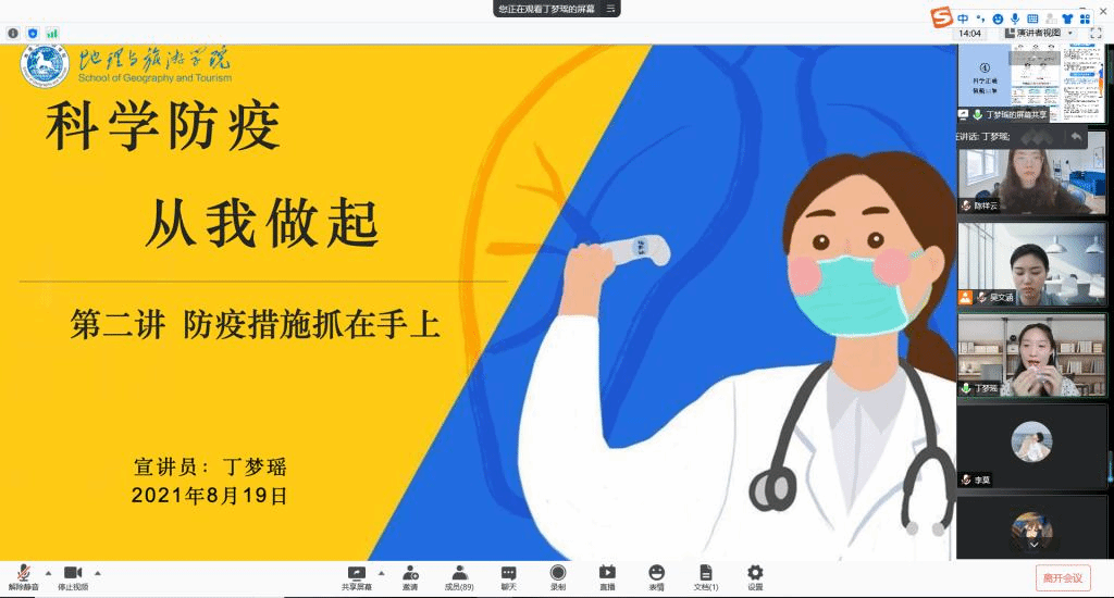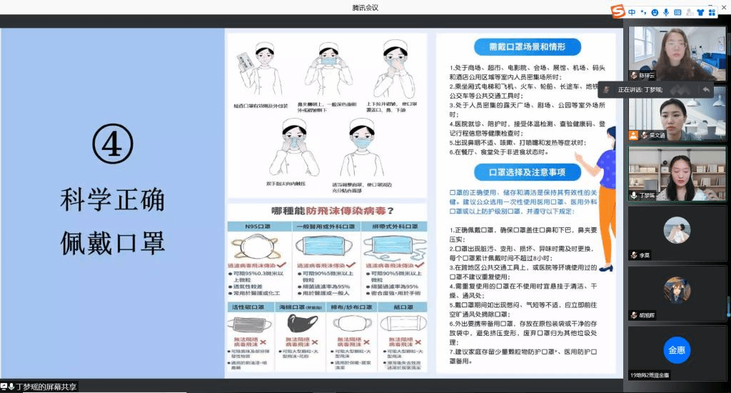 2019级地理科学拔尖人才班丁梦瑶同学以“科学防疫 从我做起”为主题为大家介绍了科学防疫小常识及学校关于疫情防控的相关要求,并根据2021年联防联控机制发布的新版“戴口罩指引”为同学们现场示范正确有效的口罩佩戴方式,提醒团员青年养成良好生活习惯,充实暑期生活,关注心理健康。