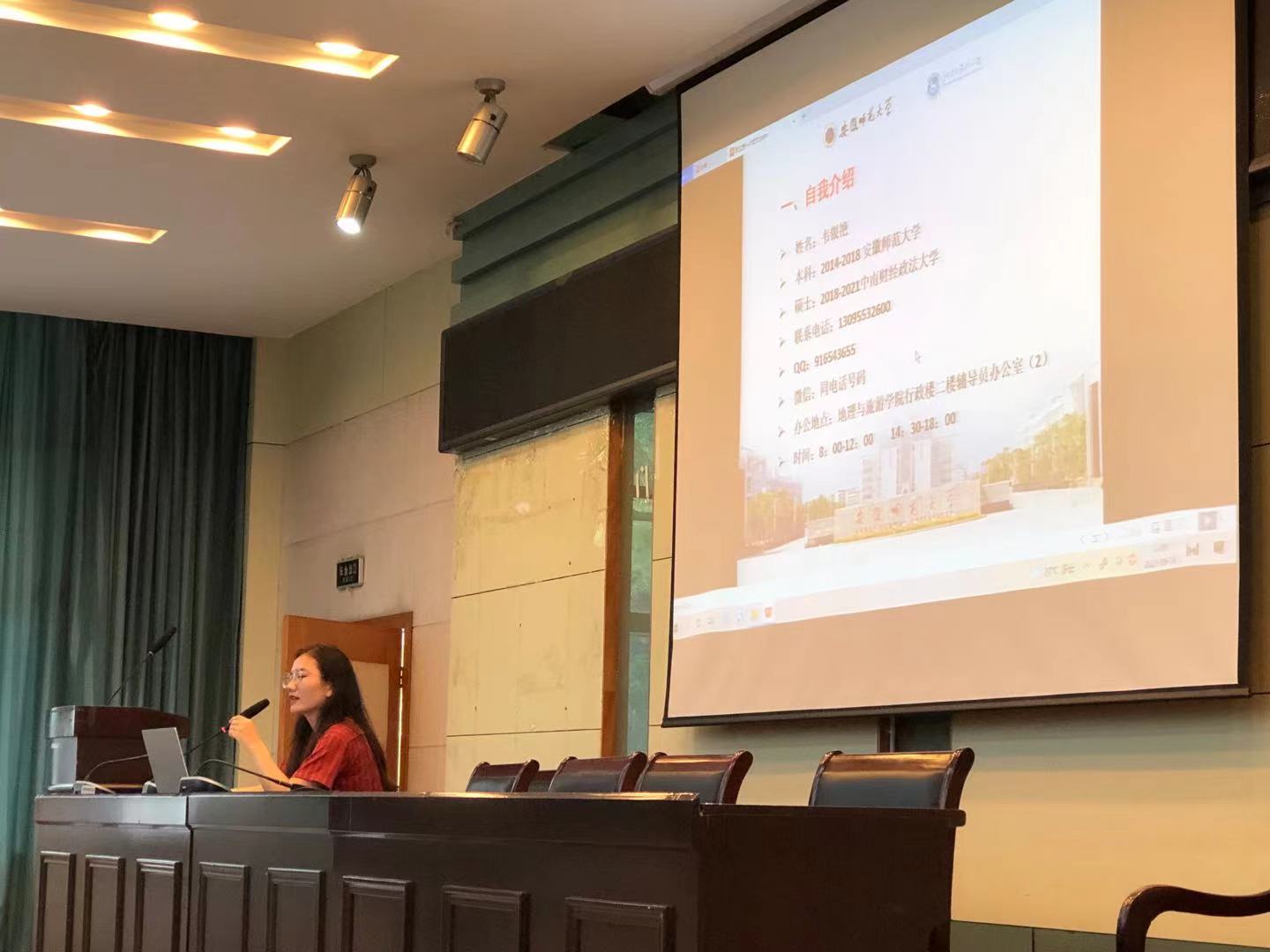 首先,韦银艳进行了自我介绍,讲述了自己在安徽师范大学的学习经历,以亲身经历引导同学们勤奋学习,珍惜每一个学习机会,积极参与导师课题项目,增强自身素质和能力,并向同学们介绍了辅导员的九大职责,使同学们明白辅导员亦师亦友,是陪伴同学们走过四年青春的人,是同学们的引路人。接下来分别向同学们强调了校内外安全教育,包括新生应注意的财产安全、网络安全、医疗急救等七类安全问题展开说明,增强学生安全意识。在组织纪律观念教育方面,导员通过介绍学生管理“四项禁令”、明德修身“十学会”和校园文明“十不为”,使学生深入了解学校校规校纪,遵规守纪。在文明礼仪教育方面,包括自身形象、网络礼仪、宿舍礼仪、咨询问题、尊重他人、校园礼仪和课堂礼仪,使同学们懂礼貌,讲礼仪,做谦逊有礼,做事有度的优秀大学生。