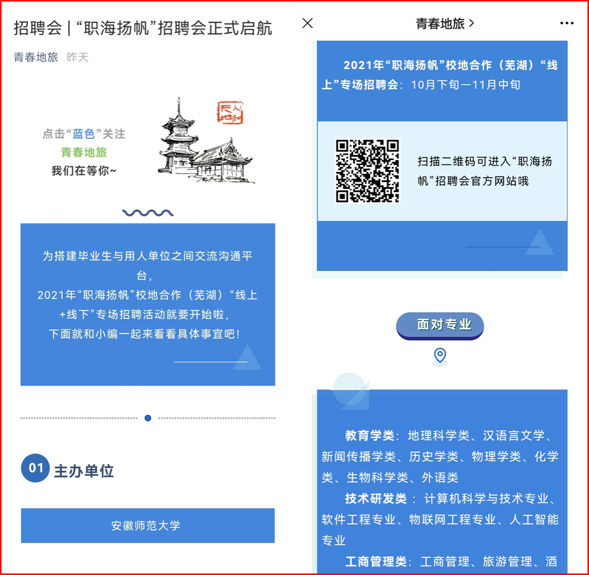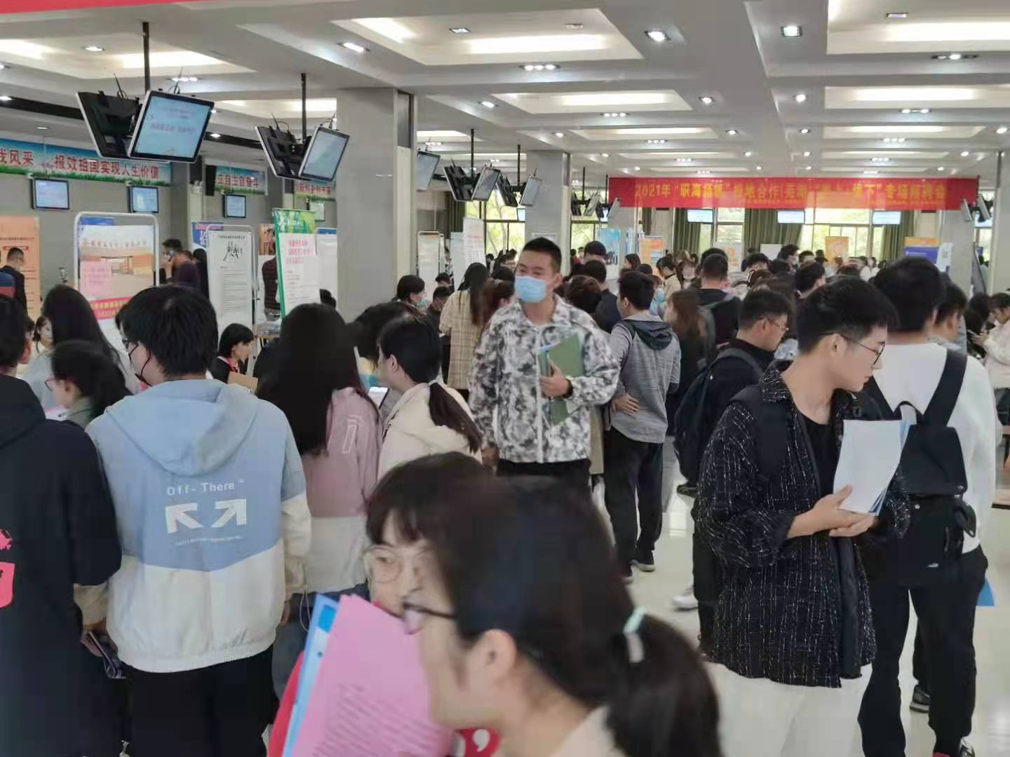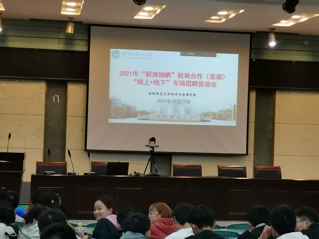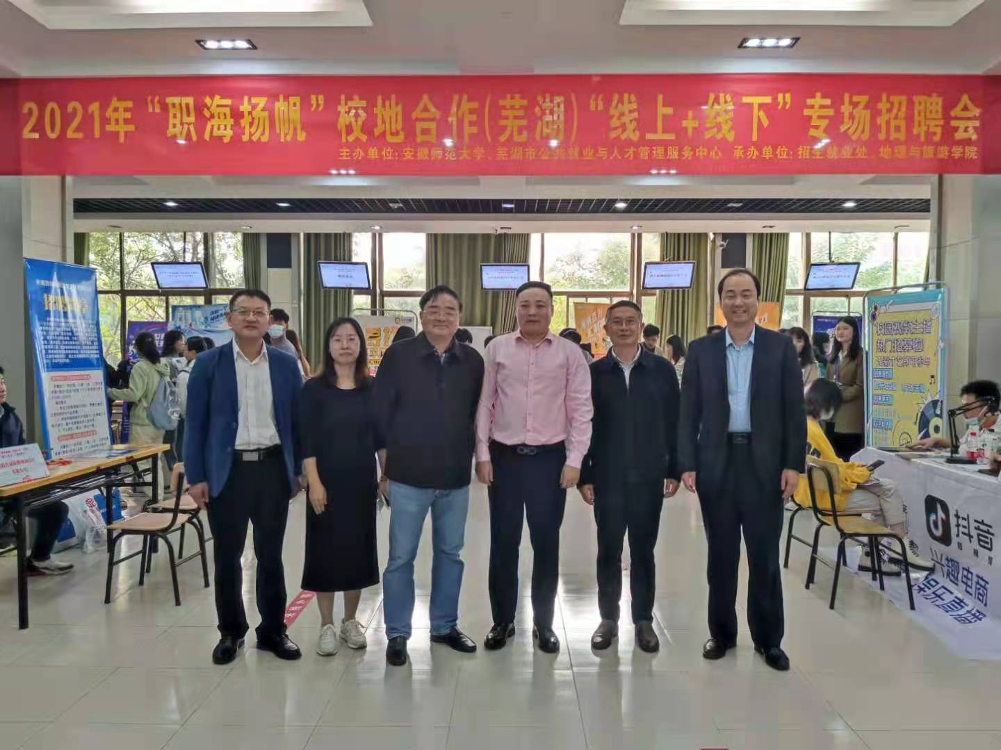 承办的安徽师范大学2021年“职海扬帆”校地合作(芜湖)“线上+线下”专场招聘会成功举办。来自京沪苏浙皖等地的科大讯飞、海螺集团、国美电器集团等世界和中国500强企业,以及安徽省旅游规划设计研究院、安徽省城建设计研究总院、安吉县教育局等119家优质企事业单位应邀参会,其中线下招聘单位60家,1100多个招聘岗位涉及文化、教育、设计、科技等多个门类。招聘会现场和线上招聘平台吸引了全校毕业生的到来。