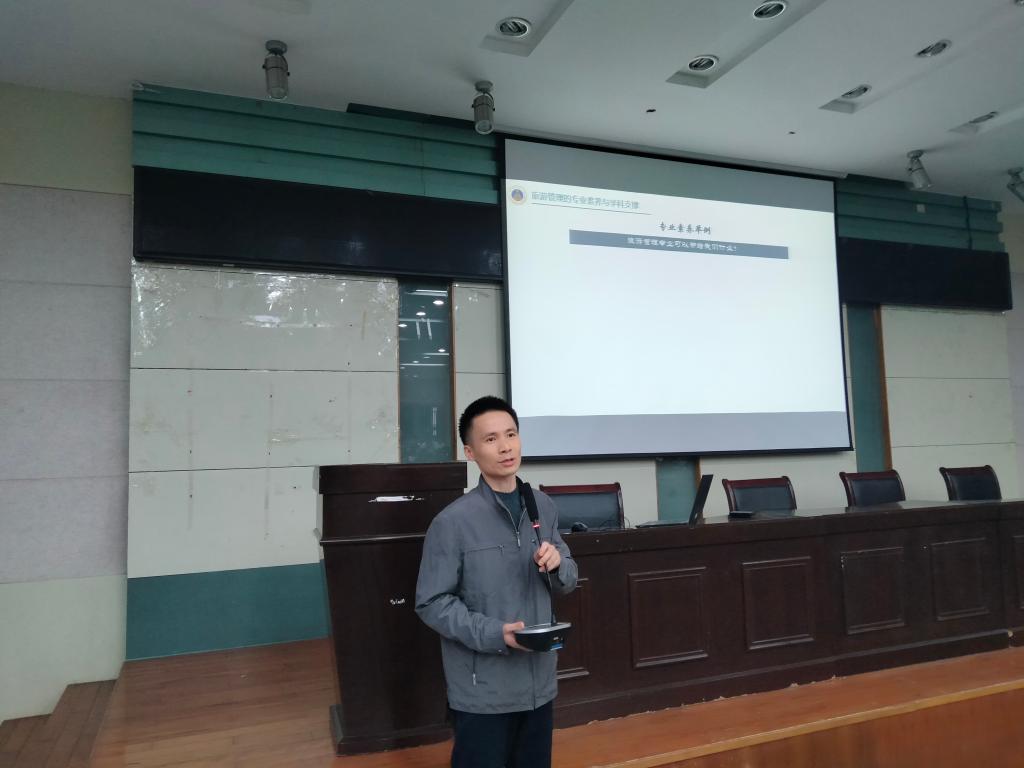 韦银艳 李炳臻)2021年11月2日下午,在地旅实验楼101报告厅,旅游管理专业教授王群、副教授黄剑锋为2021级旅游管理专业新生带来专业学习指导讲座。通过导师面对面传授个人大学学习经验和方式,帮助新生适应大学学习方式、提高学科素养、寻找学科支撑。讲座由王莉老师主持。
