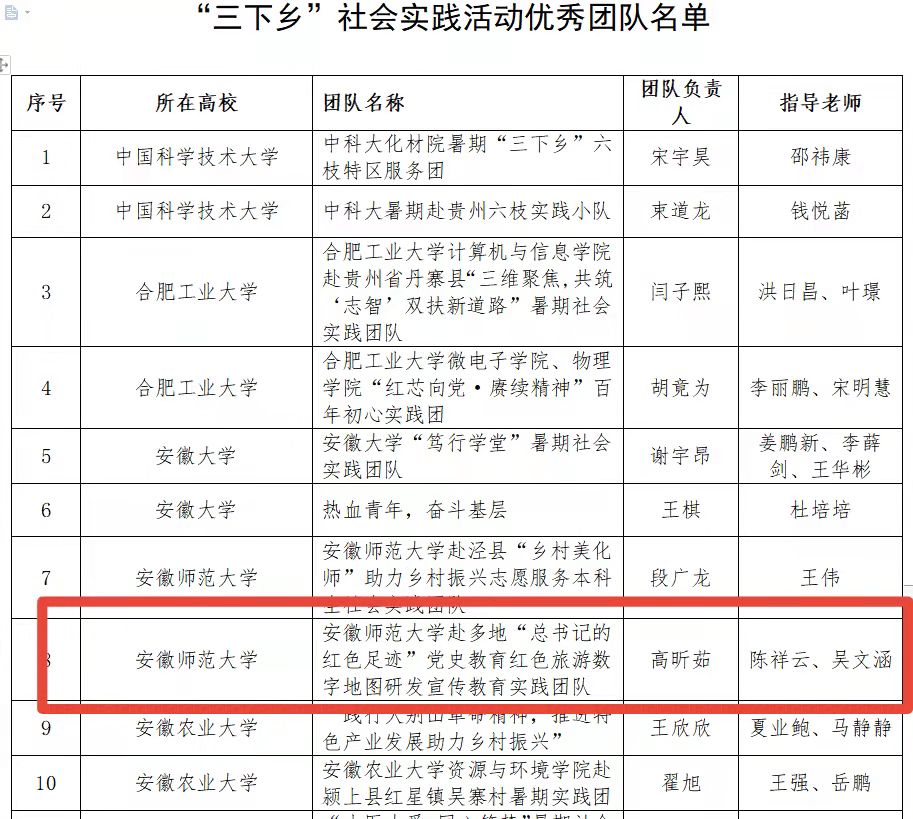 省级社会实践优秀团队为安徽师范大学赴多地“总书记的红色足迹”党史教育红色旅游数字地图研发宣传教育实践团队,该团队以学院自主研发的红色足迹数字地图成果为依托,采用“一条主线,多翼联动”的形式利用暑期社会实践广泛开展党史宣传,团队有力促进了基层群众学习党史的渠道和效果。“总书记的红色足迹”数字地图也获得中华人民共和国教育部、中国教育报等国家级官方媒体报道。