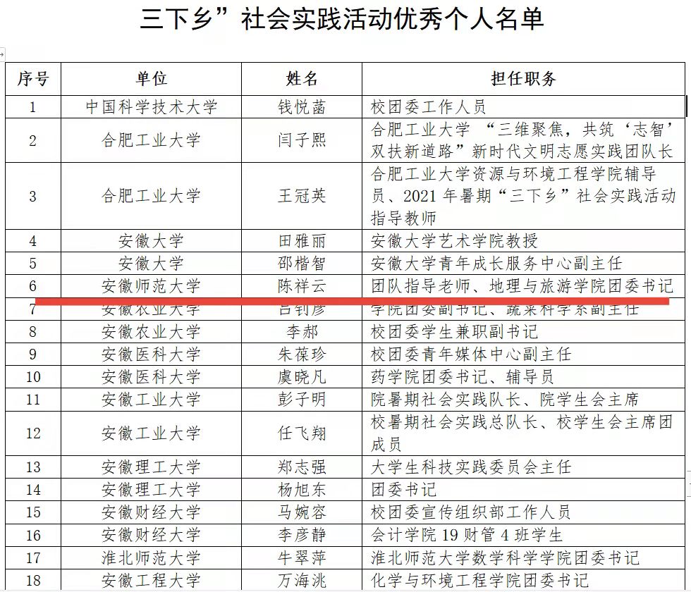 团委书记陈祥云,陈祥云曾获得安徽省微团课大赛一等奖、安徽师范大学辅导员素质能力大赛三等奖,获评安徽师范大学优秀党务工作者、安徽师范大学暑期“三下乡”社会实践活动“优秀指导教师”等荣誉称号;担任旅游本科生党支部书记期间,支部获评教育部第二批全国党建工作样板支部培育创建单位。