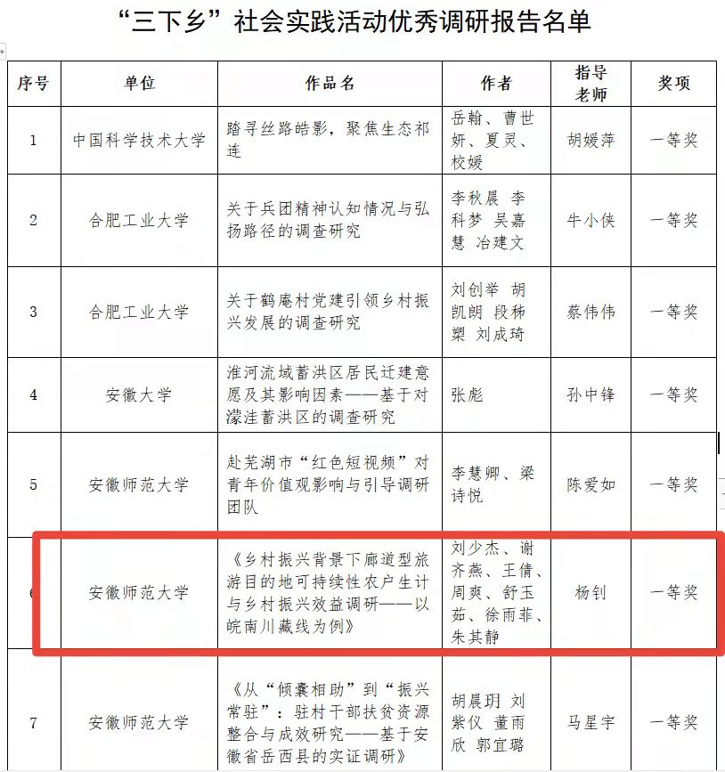 省级优秀调研报告一等奖为《乡村振兴背景下廊道型旅游目的地可持续性农户生计与乡村振兴效益调研——以皖南川藏线为例》,指导教师为足探比分