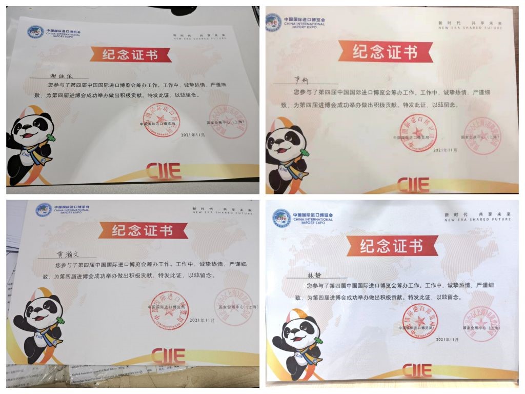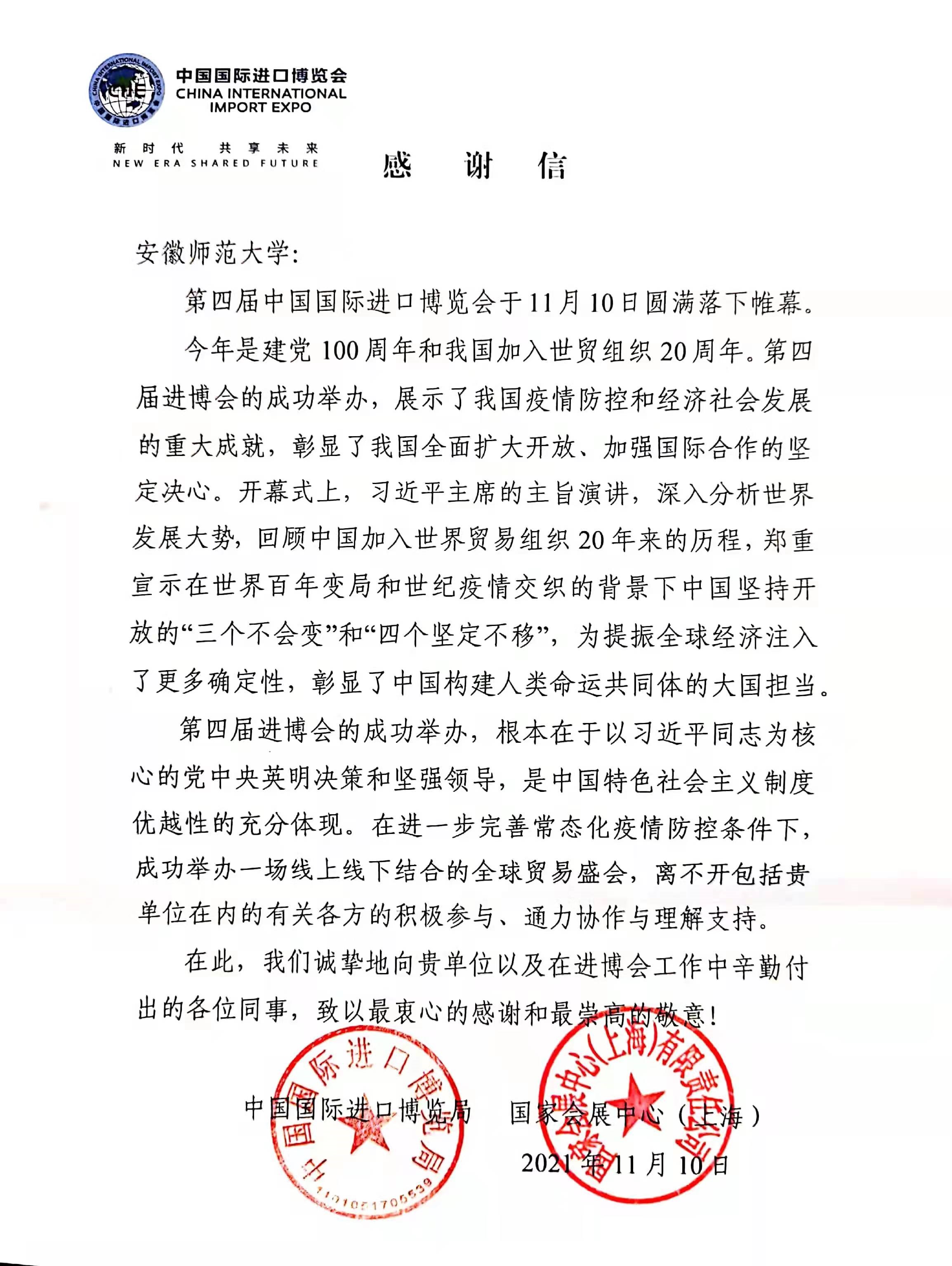 第四届国际进口博览会圆满结束,为了感谢安徽师范大学对第四届国际进口博览会的大力支持以及表扬和鼓励各位同学们在进博会期间的优异表现,中国国际进口博览总局、国家会展中心(上海)向学校发来感谢信,信中写到“在进一步完善常态化疫情防控条件下,成功举办一场线下线上结合的全球贸易盛会,离不开包括贵单位在内的有关各方积极参与、通力协作与理解支持。在此,我们诚挚地向贵单位以及在进博会工作中辛勤付出的各位同事,致以最衷心的感谢和最崇高的敬意!”另外,国家会展中心上海洲际酒店总经理贺纪斯先生为了感谢同学们在进博会期间所作出的贡献,为同学们颁发了证书和进博会文创产品。