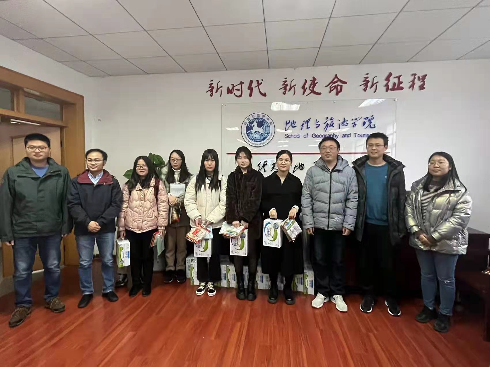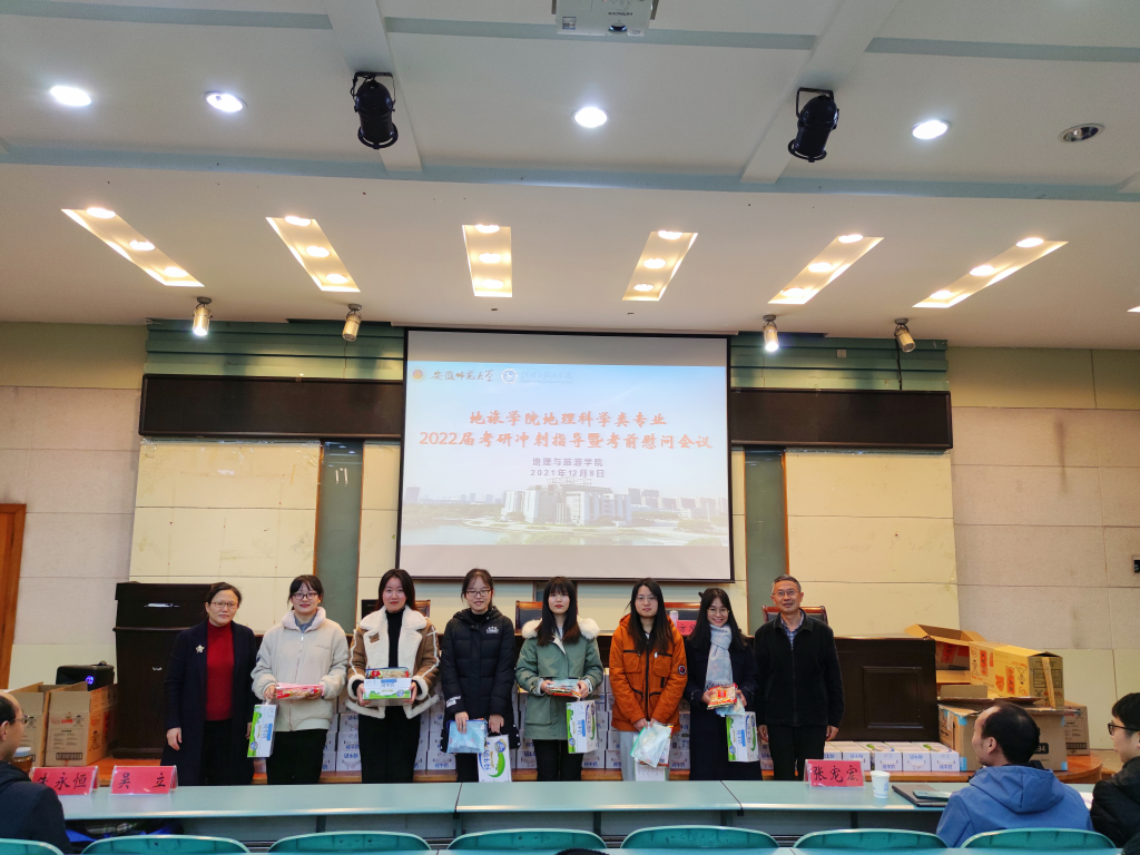 最后,学院领导、专业负责人、教师代表为考研学子分发牛奶、零食、考研文具袋等慰问品,并留影纪念。学生们纷纷表示感谢领导、老师的关心慰问,一定会全力以赴,奋战到底,不辜负自己的努力和学院的期待。