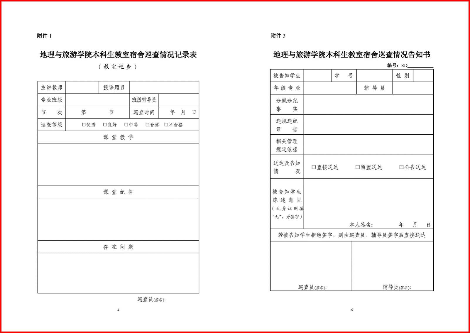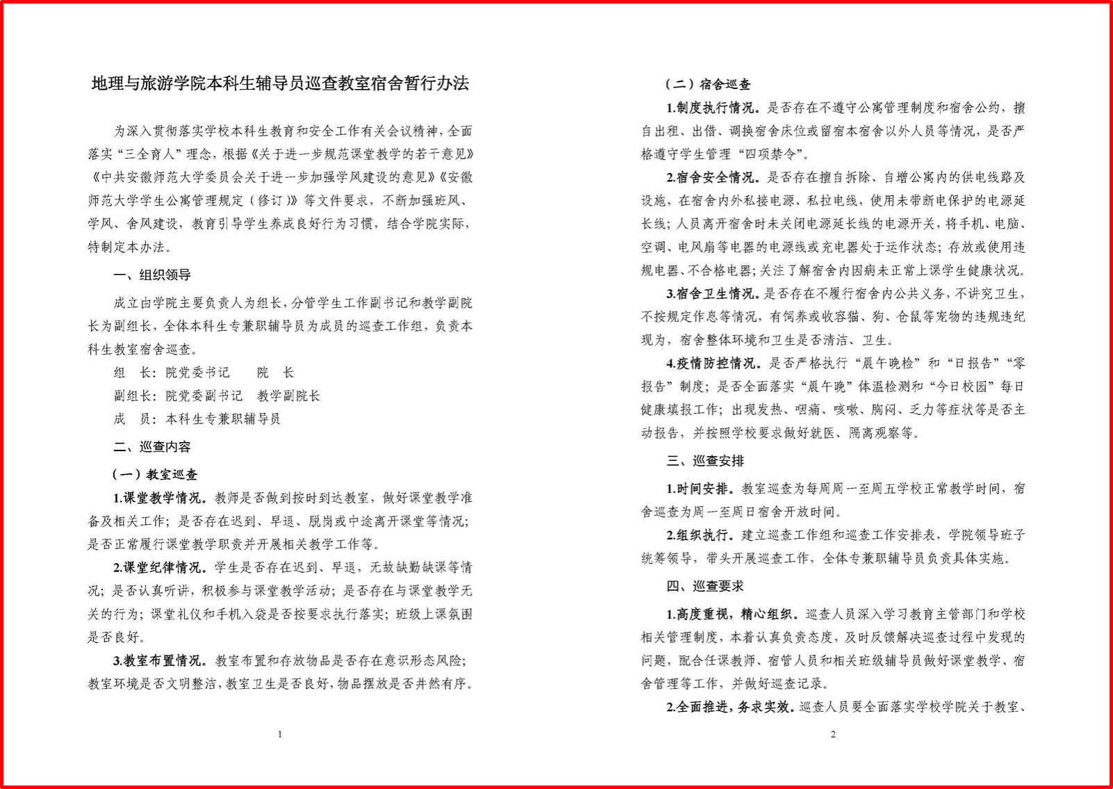 本科生辅导员巡查教室宿舍暂行办法》,规定了开展巡查工作的组织领导、巡查内容和安排、要求。
