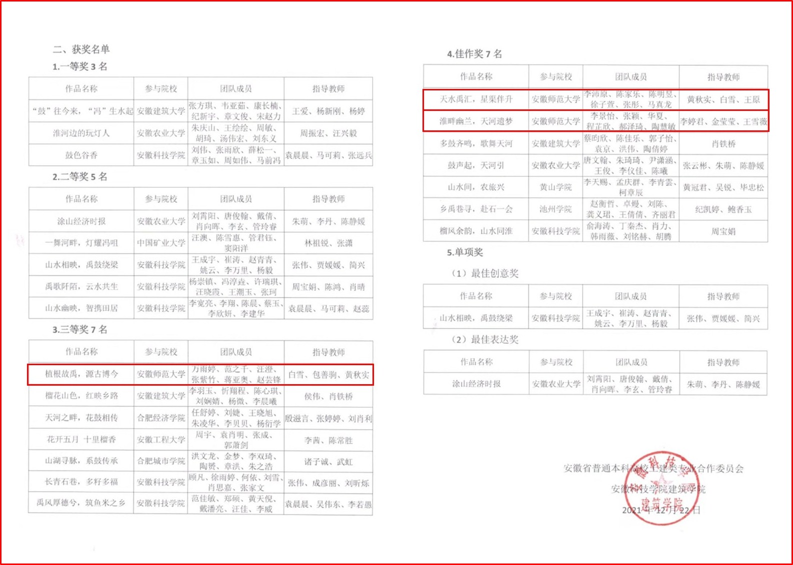 城乡规划专业教师包善驹、王原、白雪、黄秋实、李婷君、金莹莹、王雪微指导下,2019级城乡规划专业学生万雨婷、范之千、汪澄、张紫竹、蒋亚奥、赵芸锋同学的作品《植根故禹,源古博今》荣获三等奖;李沛原、陈家乐、陈明昱、徐子萱、张彤、马真龙同学的作品《天水禹汇,星渠伴升》荣获佳作奖;李景怡、张颖、华夏、程芷欣、郝泽琦、陶慧敏同学的作品《淮畔幽兰,天河遗梦》荣获佳作奖。
