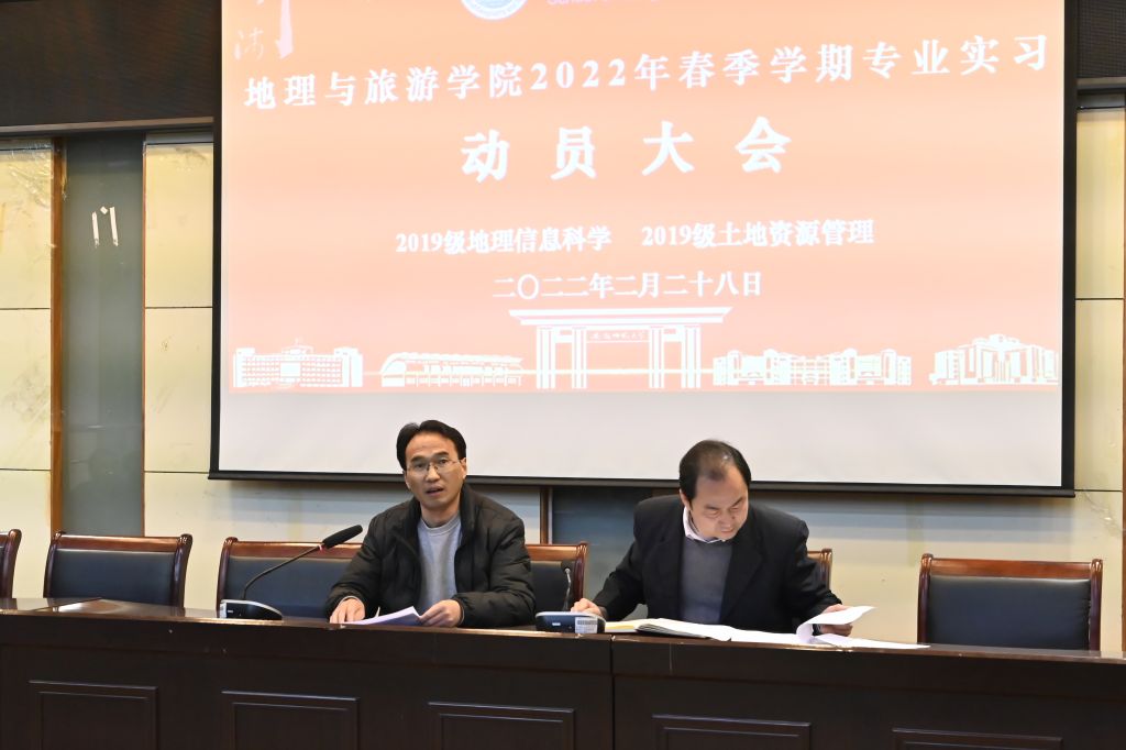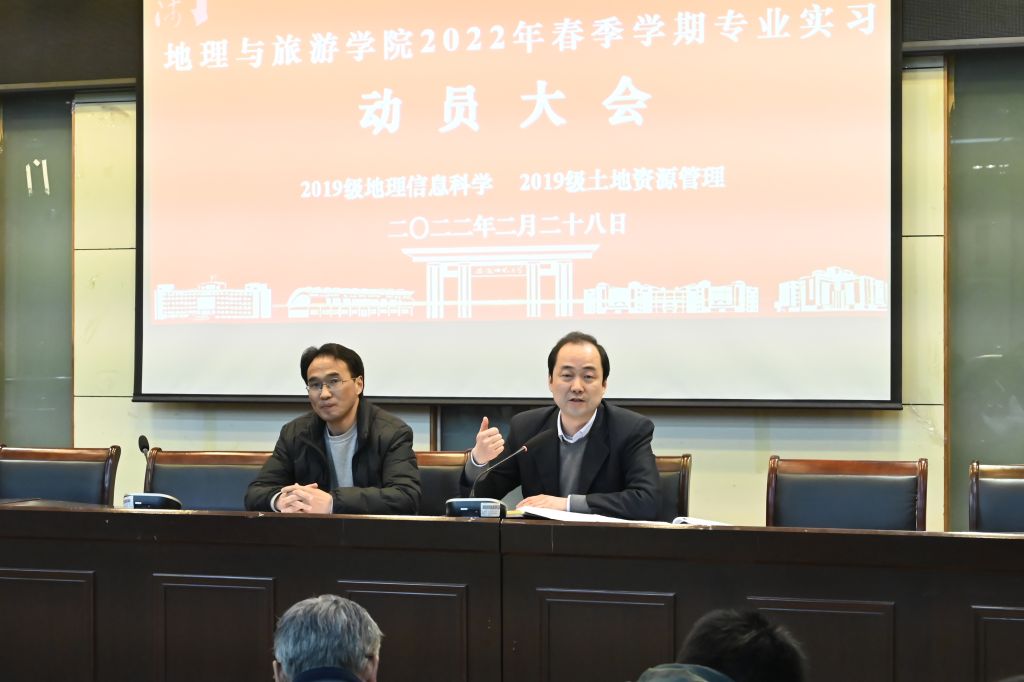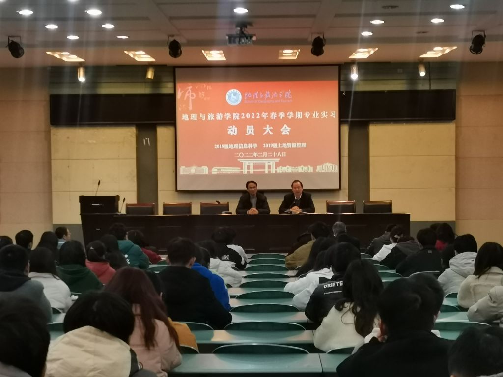 在实验楼101报告厅召开春季学院本科生专业实习动员大会,学院党委副书记乔静,教学副院长杨兴柱,2019级地理信息科学、土地资源管理专业全体实习师生参加会议。会议由学院本科生专业实习秘书张运主持。