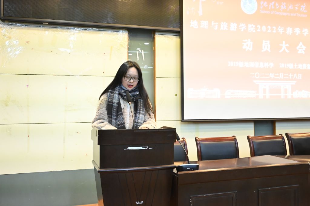 2019级地理信息科学专业黄孙玮彧同学作为实习生代表发言。她表示一定倍加珍惜来之不易的专业实习机会,努力将专业所学运用到价值生产、社会服务中去,并代表全体实习郑重承诺在接下来的专业实习中严格遵守实习纪律,恪尽职守、爱岗敬业,脚踏实地、勤奋学习,不辜负学校学院和各位师长的期待,踔厉奋发、笃行不怠。