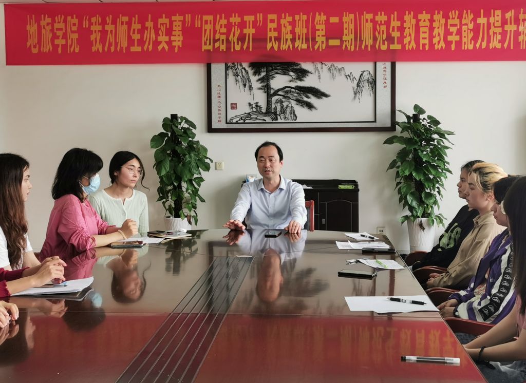 于学院行政楼四楼会议室举行“我为师生办实事”“团结花开”民族班(第二期)师范生教育教学能力提升辅导开班仪式,学院党委副书记乔静、“团结花开”民族班班主任赵佳慧、辅导员齐小学、丁茹栩、朋辈帮扶小导师代表及边疆少数民族学生参与此次开班式。少数民族学生代表玛依奴尔.托合提苏拉依曼同学及朋辈帮扶小导师代表许文敬同学代表发言。学院党委副书记乔静表示,学校学院高度重视边疆地区少数民族学生的教育培养工作,深入践行以师生为中心的发展思想,持续聚焦少数民族学生“急难愁盼”问题,坚持不懈为师生办实事办好事,尽最大努力创造条件关心帮助少数民族学生成长成才。同时,他向全体同学提出三点要求:一是希望同学们珍惜此次课程辅导的机会,切实提高自身师范生教育技能;二是希望班级同学间能够互相学习,发挥朋辈间“传帮带”作用;三是希望同学不仅要提高知识技能,更要提高自身的政治觉悟和精神境界,做到“德智体美劳”五育并举、全面发展,成为“德才兼备、知行合一”的优秀青年,为民族团结和中华民族伟大复兴贡献力量。