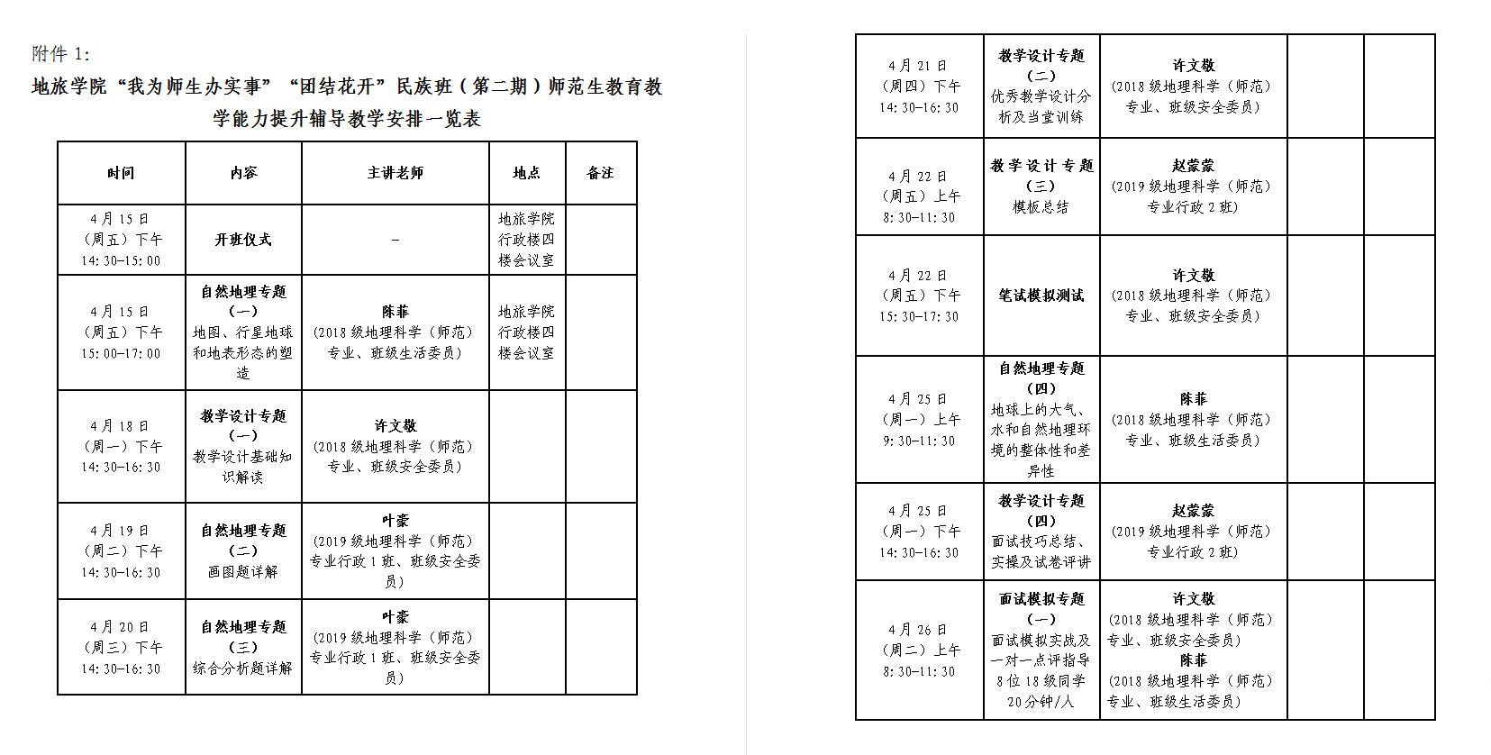 此次辅导班开设了自然地理、教学设计、笔试模拟、面试模拟四个专题的教学课程,为期三周,共计40课时。在正式开始培训前,学院多次召开提前摸排摸底会议、备课研讨会议、课程设计准备会议等,确保辅导班顺利开展。此次授课培训紧紧抓住理论教学和技能培训两方面,自然地理专题课程的设计注重理论教学,夯实同学们的专业知识基础,教学设计的培训,旨在提升同学们的师范生基本功,夯实从教技能,用扎实本领站稳三尺讲台。笔试、面试模拟课程则抓住同学们的实际需求,让学生提前适应教师资格证考试的答题规则,避免考生在考试时出现类似的错误,达到“以考促教”、“以考促学”的目的。4月26日上午,在学院三楼、四楼会议室分批举行了模拟面试,17位学员依次参加模拟面试,熟悉整体面试流程,小导师们对学员们进行一对一面试指导,学院党委副书记乔静、辅导员丁如栩全程参与模拟面试,并就同学们模拟面试中的表现予以点评指导,并勉励同学们树立自信,从容应考,充分发挥培训成效,以良好的精神面貌和扎实的知识技能在即将开展的教师资格证校内考试中创造好成绩。