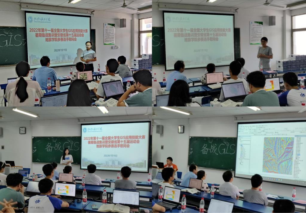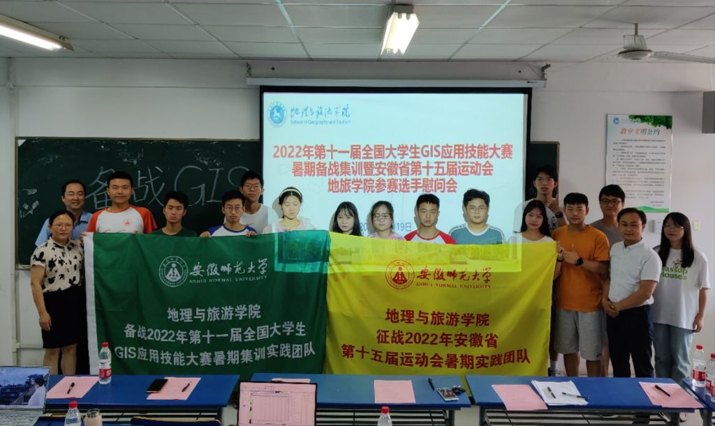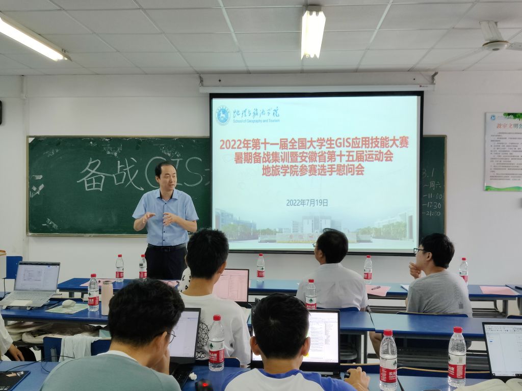 在实验楼202教室召开2022年第十一届全国大学生GIS应用技能大赛暑期备战集训暨安徽省第十五届运动会参赛选手慰问会,学院院长方凤满、党委副书记乔静、地理信息科学专业负责人汪左、指导教师姜伟、辅导员代表以及全体暑期留校集训学生参会。