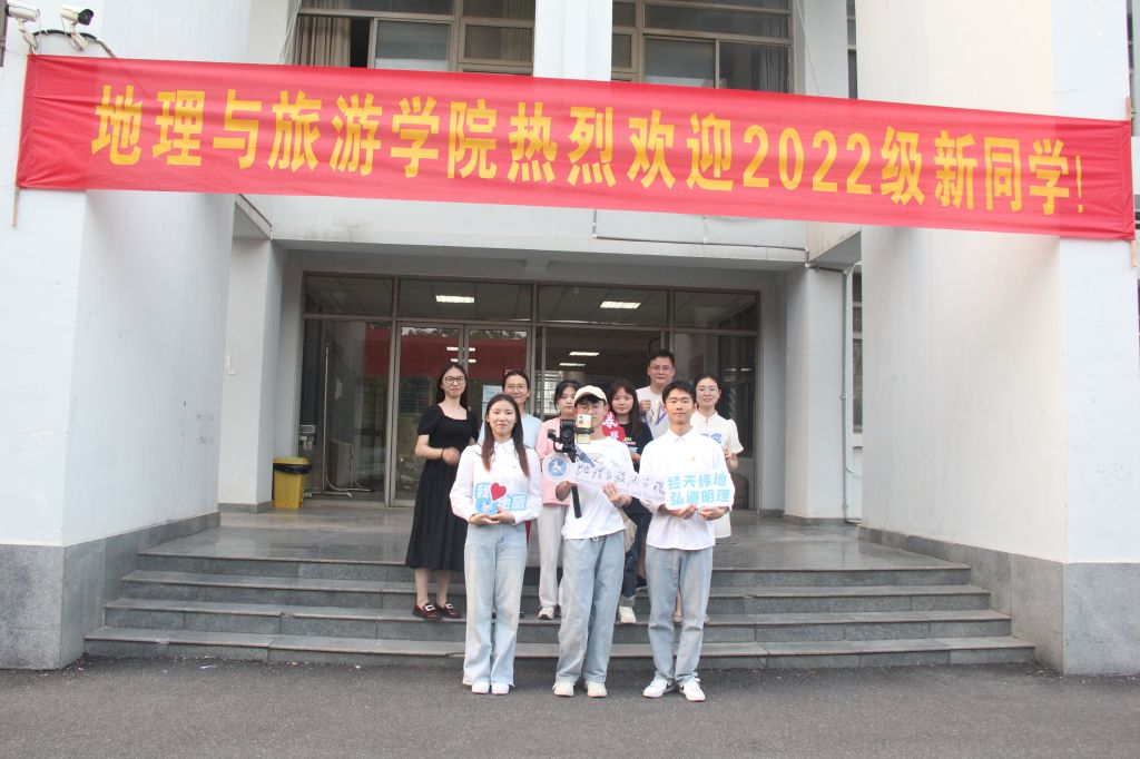 “现在我们所在的位置是学校东大门和敬文图书馆的连接轴线上,大家可以看到‘厚德 重教 博学 笃行’八个大字,这就是我们师大的校训。”2021级地理科学专业蔡子坤和2021级旅游管理专业张新悦“变身”主播带领新生由学校东大门开始游览校园。