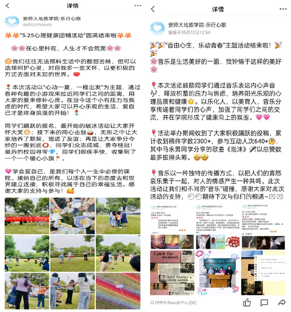 举办““心动一夏,一程出发”团辅活动、“辩由心声,熠熠人生”心理辩论赛、“音由心生,乐动青春”音乐分享活动、“心灵光影之旅”观影活动等。通过趣味运动会、才艺表演、趣味游戏等环节为同学们提供互相交流的平台,缓解学生日常的学业压力,营造良好的心理健康教育氛围。