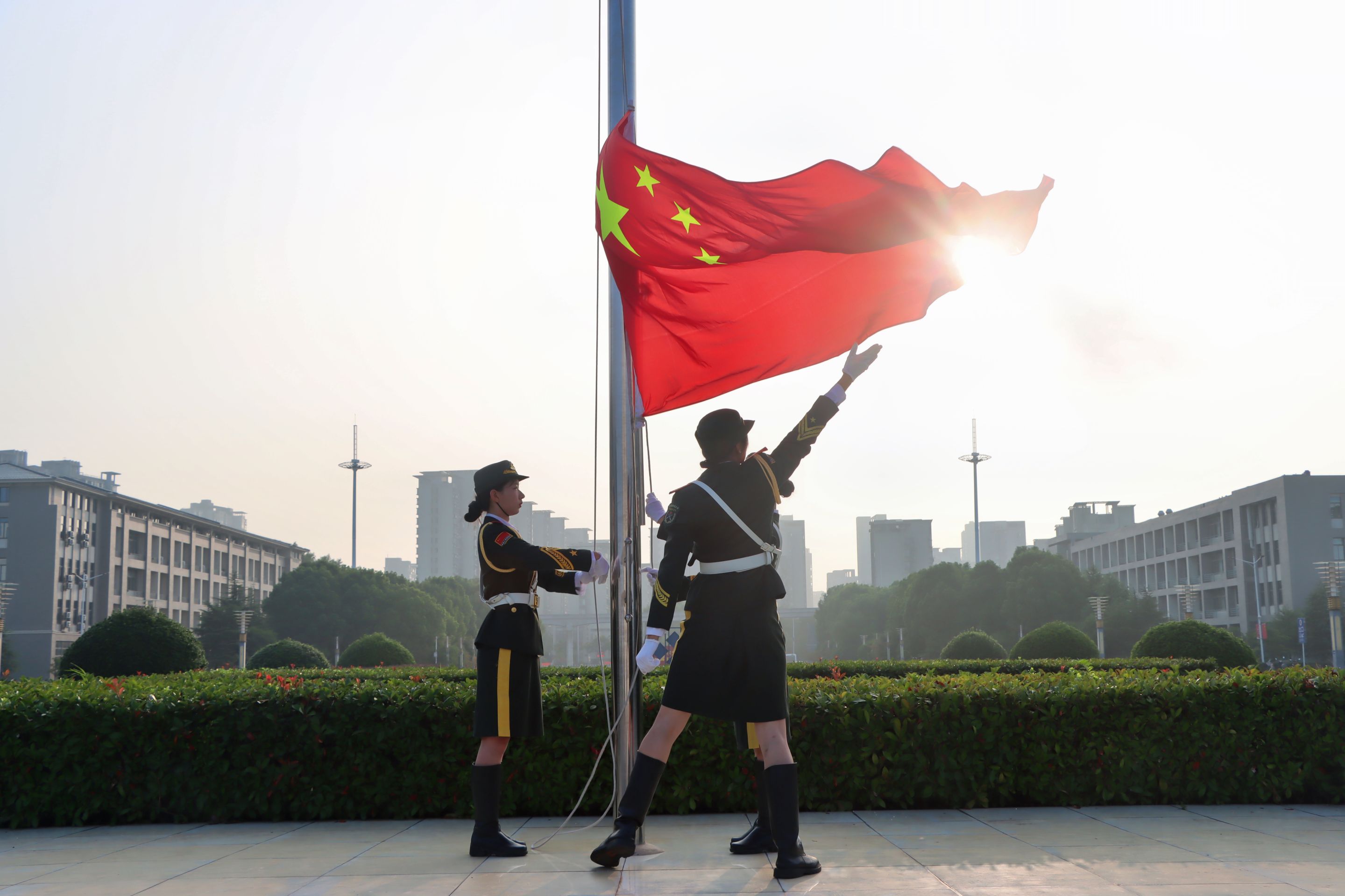 晨曦微露,旭日东升。国旗护卫队的旗手们整装待发,随着一声令下,昂首阔步而行,以庄严的姿态护送国旗入场。迎着清晨第一缕晨光,在全体师生的注视下,五星红旗冉冉升起,雄壮的国歌声响彻广场。
