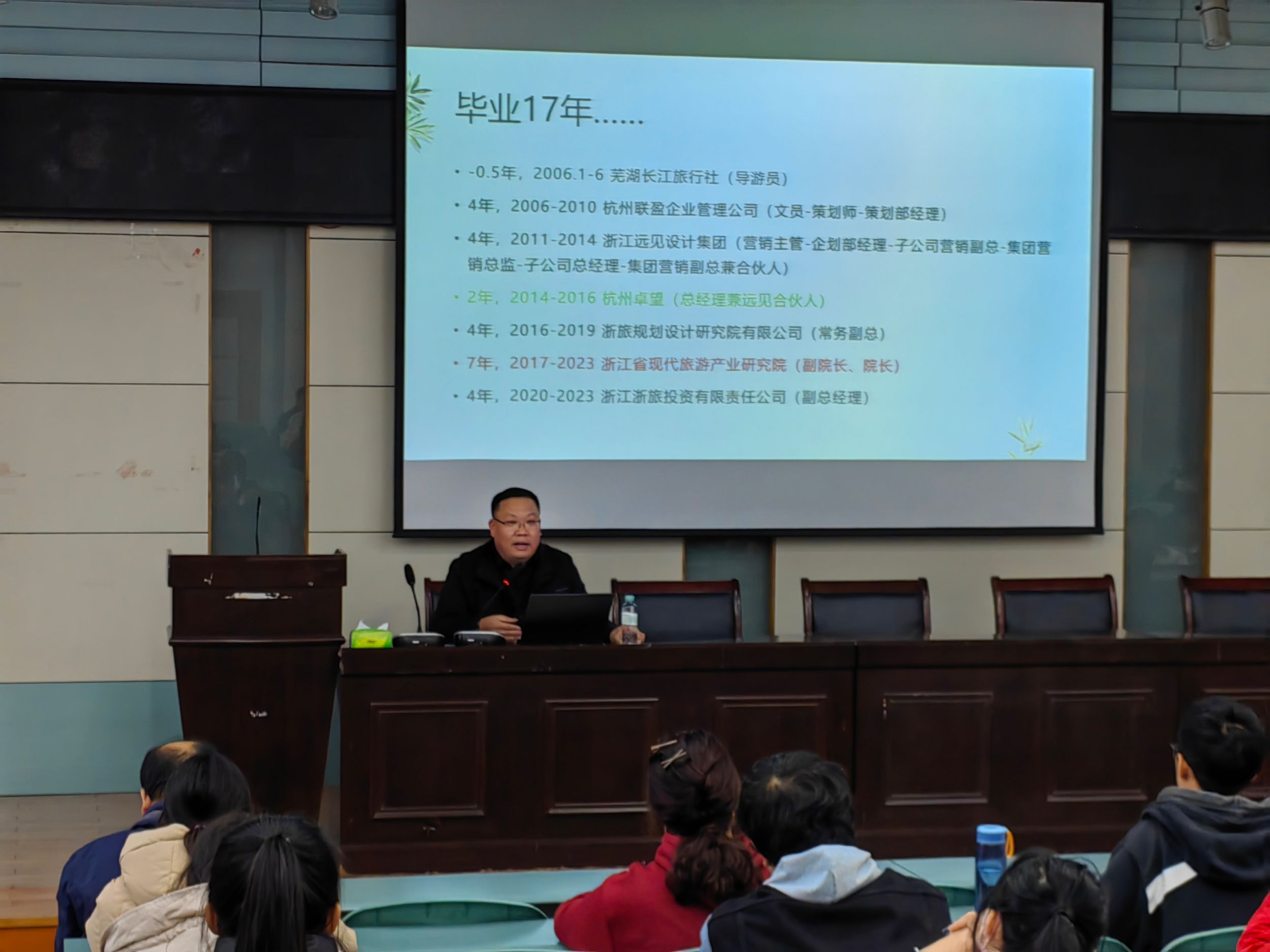 12月3日下午,浙江省旅游投资集团投资公司副总经理、浙江省现代旅游产业研究院院长、浙江浙旅规划设计研究院有限公司董事长兼总经理、浙江省文化产业促进会旅游分会秘书长、2002级旅游管理专业毕业生黄河应邀为地旅学子作题为《旅游行业——现在和未来》的专题报告,旅游管理专业教师代表、辅导员代表、2023级旅游管理专业本科新生参加。专题报告由旅游管理专业负责人杨钊教授主持。