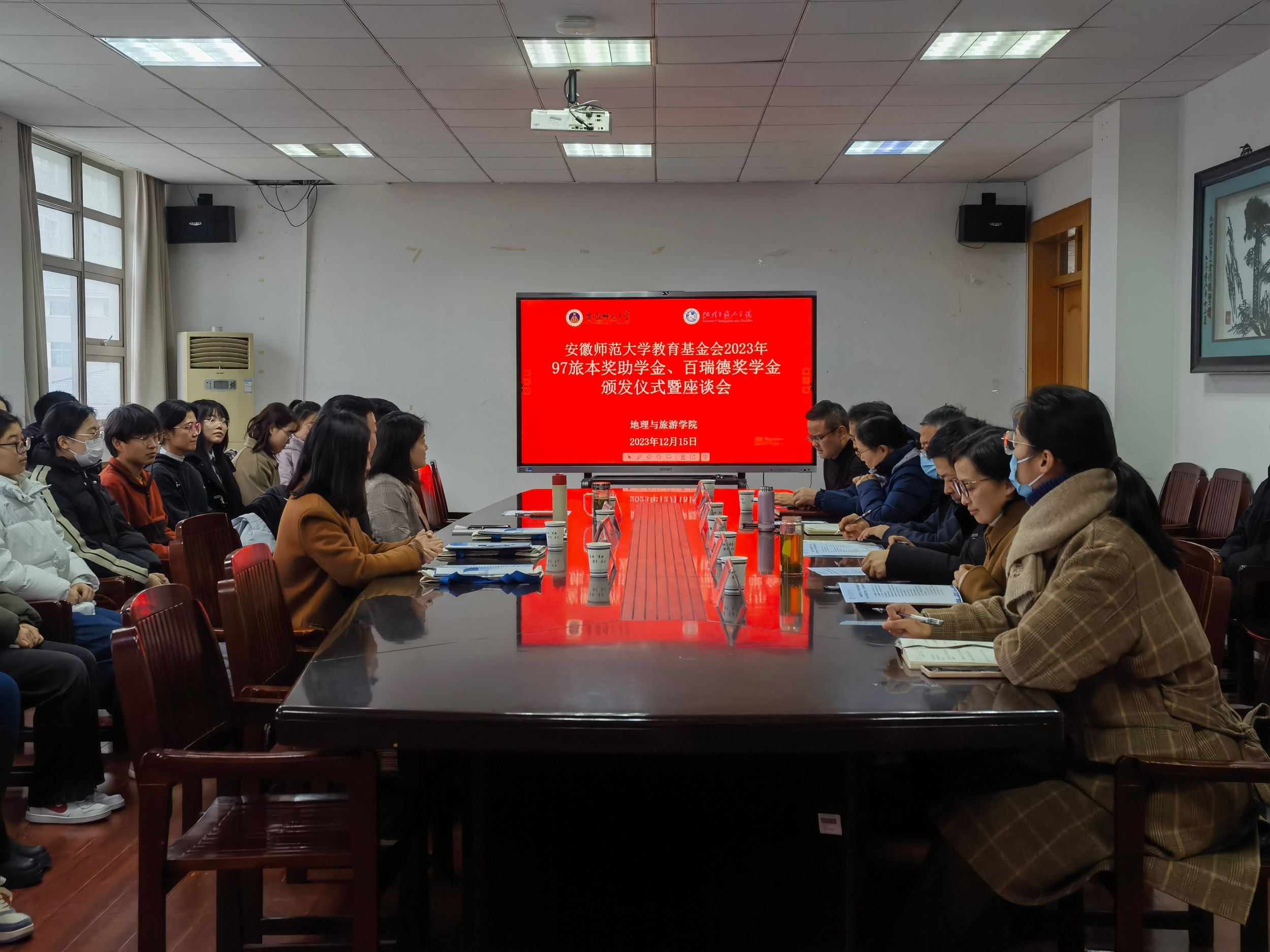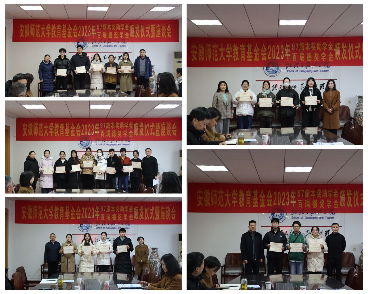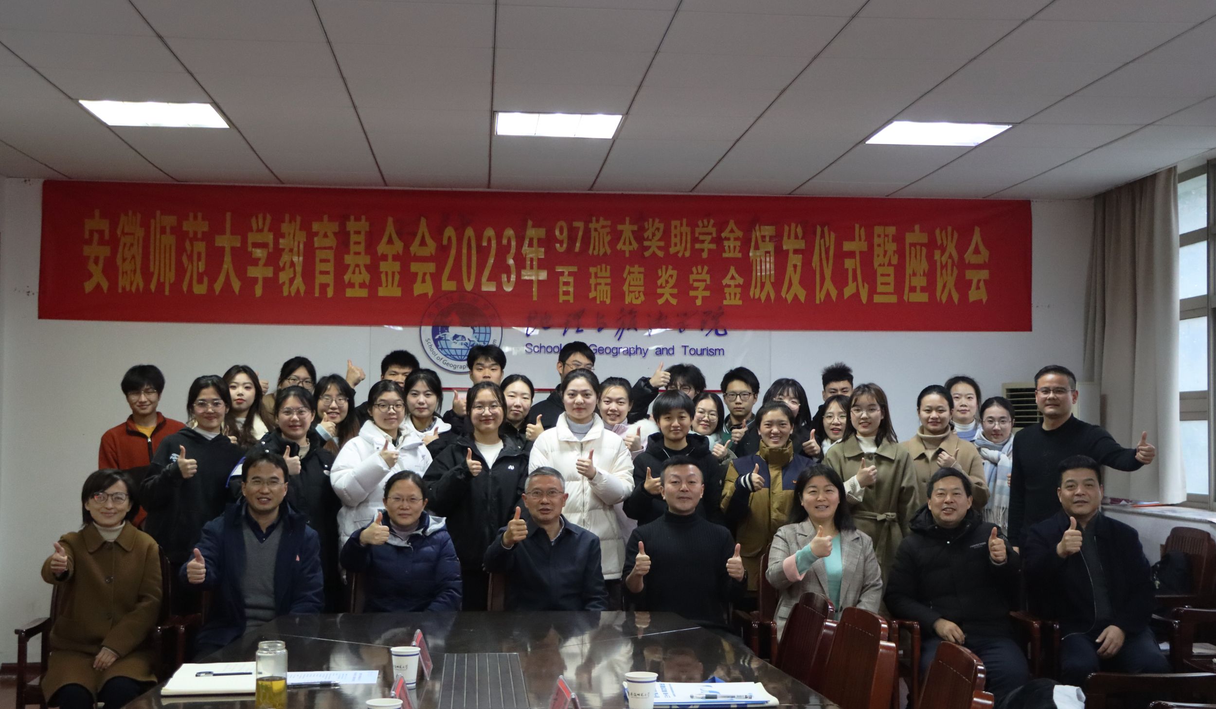2023年“97旅本”奖助学金、百瑞德奖学金颁发仪式暨座谈会在学院行政楼三楼会议室举行。资助方代表晨星资讯有限公司何高山,安徽商贸职业技术学院黄亮、齐莉莉,安徽师范大学尹寿兵,以及学院党政领导班子全体成员,辅导员代表,“97旅本”、百瑞德获奖受助学生代表出席本次活动。活动由学院党委副书记付勇主持。