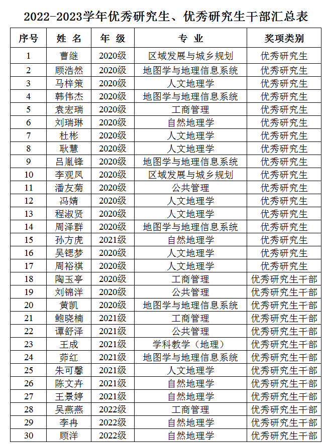 根据《关于做好2022-2023学年研究生先进个人评选工作的通知》(校研工部〔2023〕4号)等文件精神和要求,学院在坚持公开、公正、公平原则的基础上,通过本人申请、民主评议、研究生工作办公室提出初步人选、学院审核推荐等程序,现确定学院2023年优秀研究生及优秀研究生干部拟推荐名单。现公示如下: