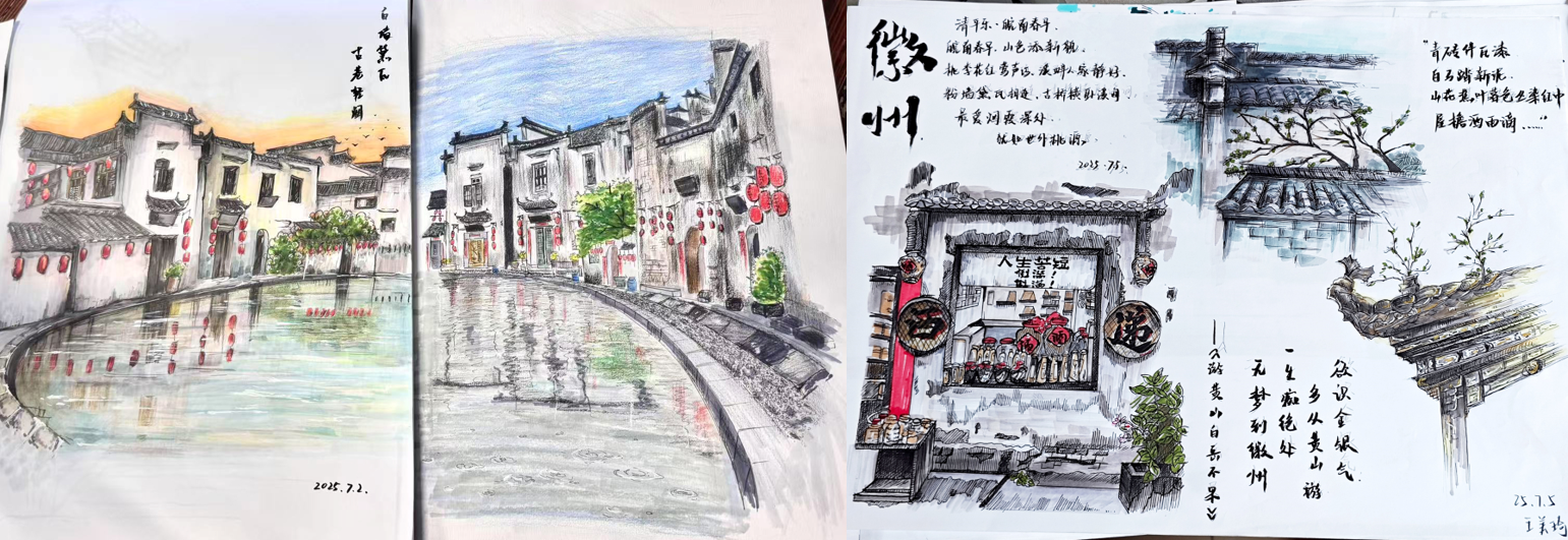在实地调研过程中,同学们以专业视角审视古村落景观,以手绘方式记录徽派建筑的独特韵味。通过细致观察与写生创作,进一步加深了对传统建筑构成、空间组织和文化意涵的理解。在专业教师的现场指导下,学生们不断提升绘画表现力,激发设计思维,真正实现了课堂知识与实践应用的深度融合。