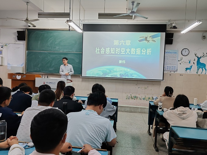 姜伟副教授从社会感知的话题切入,引入本节重点讲解内容:社会感知的概念与技术手段、社会感知时空数据特征与分析方法及具体案例分析。姜伟副教授详细讲解了社会感知时空数据的概念、特征、多样性、数据处理方法,通过商业区选址等多个应用案例生动表明社会感知时空数据能研究人类时空行为特征,从而揭示社会经济现象的时空分布格局与演化规律,弥补现有遥感方法的不足。讲课的内容丰富多彩,思路清晰,课堂教学节奏紧凑,内容生动形象。
