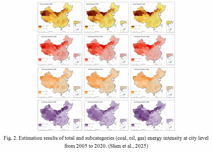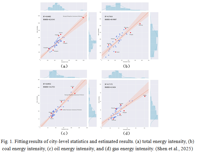 能源强度(单位GDP能耗)是衡量能源利用效率的重要指标。受限于现有能源强度统计体系,相关研究多停留在国家和省级宏观尺度,不仅存在数据时效性差、空间分辨率不足的突出问题,更缺乏对煤炭、石油、天然气等细分能源品种使用强度的精准测算。本研究基于DMSP/VIIRS传感器定标后的夜间灯光数据,结合OMI、MODIS等遥感传感器获取的SO2、NO2、PM2.5等大气污染物浓度数据,构建了城市层面的能源消费特征指标体系。通过深度神经网络(DNN)建模,首次实现了中国城市尺度上总能源强度以及煤炭、石油、天然气等主要能源品种强度的空间化高精度估算。研究结果不仅拓展了能源强度估算的空间分辨率和能源类型细分维度,也为精细化能源管理与城市级差异化减排政策制定提供了科学依据。