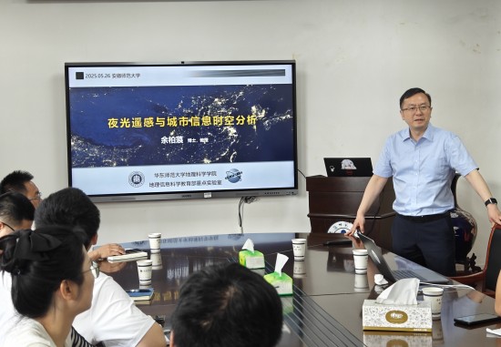 讲学,并做了题为《夜光遥感与城市信息时空分析》的学术报告。报告在学院行政楼四楼会议室举行,学院相关专业的教师和研究生参加了此次报告。