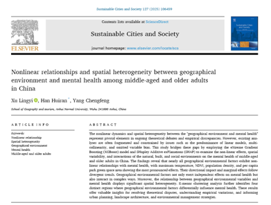 韩会然副教授团队在《Sustainable Cities and Society》(中科院一区Top,IF=10.5)发表了题为“Nonlinear relationships and spatial heterogeneity between geographical environment and mental health among middle-aged and older adults in China”的研究论文。论文第一作者为2021级硕士许岭怡同学,通讯作者为球探足球比分app